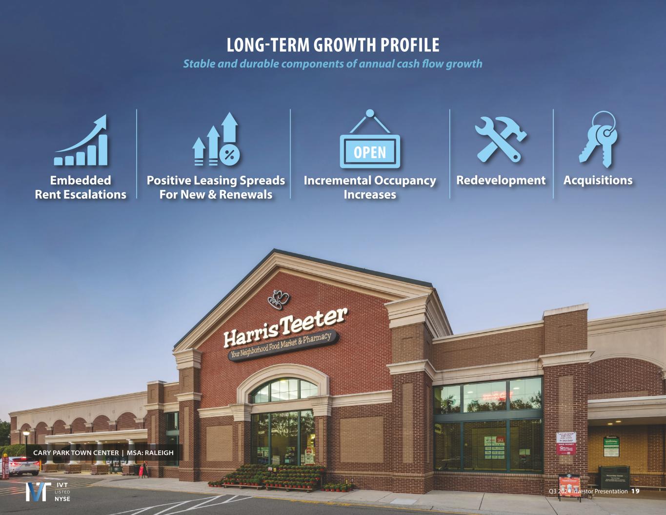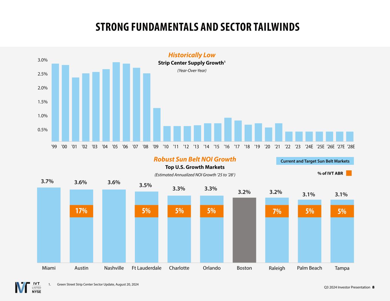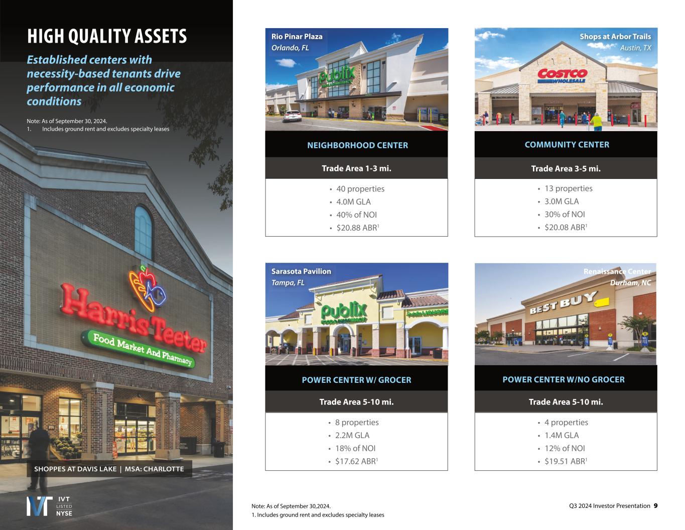 Q3 2024 Investor Presentation 8 TampaPalm BeachRaleighBostonOrlandoCharlotteFt LauderdaleNashvilleAustinMiami STRONG FUNDAMENTALS AND SECTOR TAILWINDS 1. Green Street Strip Center Sector Update, August 20, 2024 Historically Low Strip Center Supply Growth1 (Year-Over-Year) Robust Sun Belt NOI Growth Top U.S. Growth Markets (Estimated Annualized NOI Growth ‘2 to ‘281) 17% 5% 5% 5% 5%7% 5% Current and Target Sun Belt Markets % of IVT ABR 0.5% 1.0% 1.5% 2.0% 2.5% 3.0% 0.0% '99 '00 '01 '02 '03 '04 '05 '06 '07 '08 '09 '10 '11 '12 '13 '14 '15 '16 '17 '18 '19 '20 '21 '22 '23 '24 '25E '26E '27E '28E 0.5% 1.5% 2.5% 1.0% 2.0% 3.0% 3.7% 3.6% 3.6% 3.5% 3.3% 3.3% 3.2% 3.2% 3.1% 3.1%