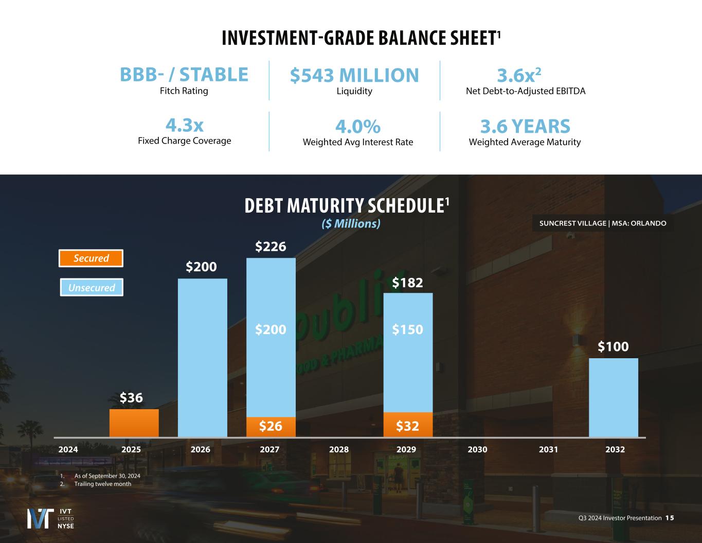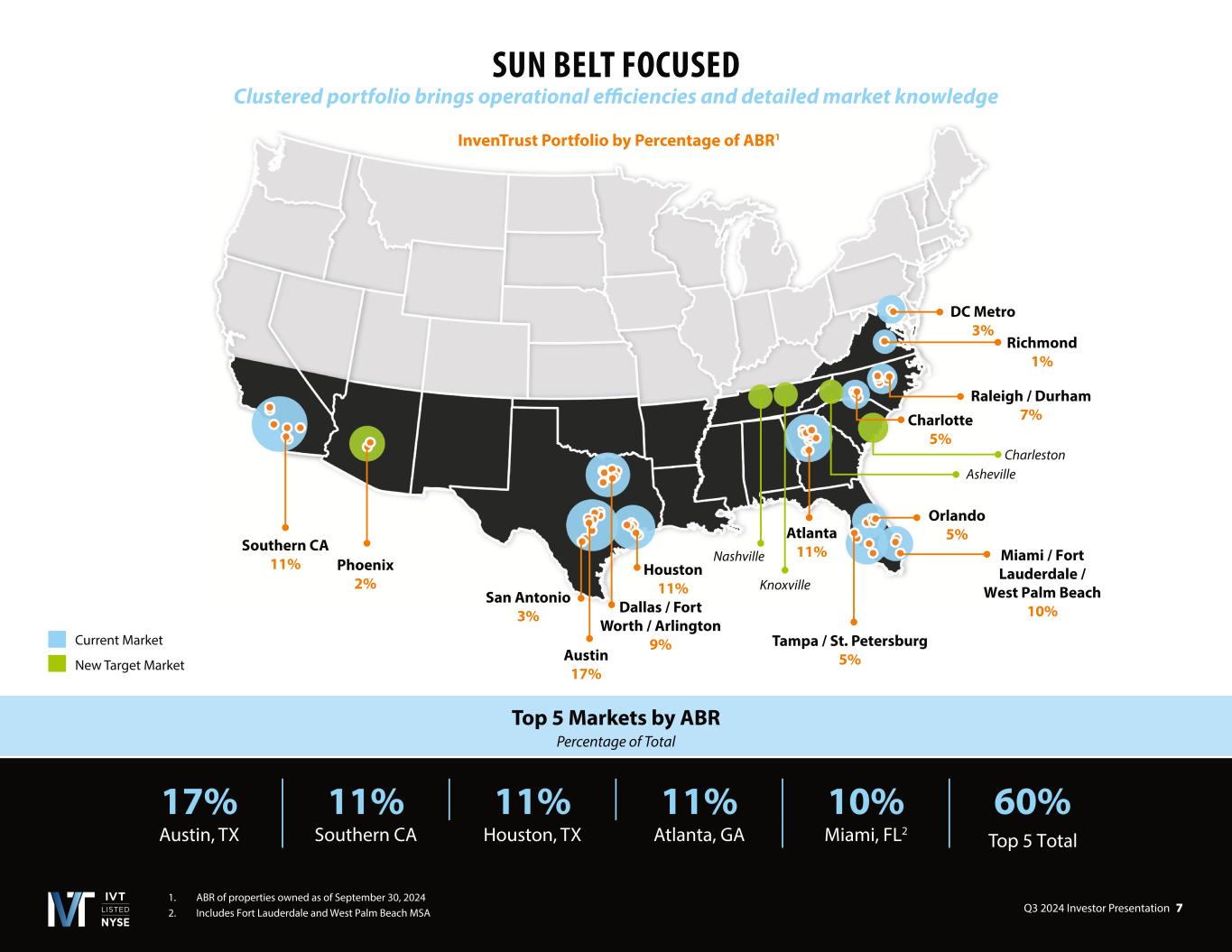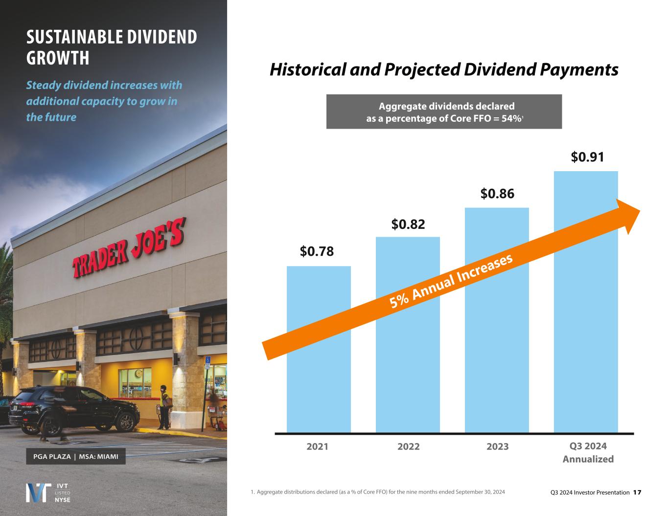 Q3 2024 Investor Presentation 8 TampaPalm BeachRaleighBostonOrlandoCharlotteFt LauderdaleNashvilleAustinMiami STRONG FUNDAMENTALS AND SECTOR TAILWINDS 1. Green Street Strip Center Sector Update, August 20, 2024 Historically Low Strip Center Supply Growth1 (Year-Over-Year) Robust Sun Belt NOI Growth Top U.S. Growth Markets (Estimated Annualized NOI Growth ‘2 to ‘281) 17% 5% 5% 5% 5%7% 5% Current and Target Sun Belt Markets % of IVT ABR 0.5% 1.0% 1.5% 2.0% 2.5% 3.0% 0.0% '99 '00 '01 '02 '03 '04 '05 '06 '07 '08 '09 '10 '11 '12 '13 '14 '15 '16 '17 '18 '19 '20 '21 '22 '23 '24 '25E '26E '27E '28E 0.5% 1.5% 2.5% 1.0% 2.0% 3.0% 3.7% 3.6% 3.6% 3.5% 3.3% 3.3% 3.2% 3.2% 3.1% 3.1%