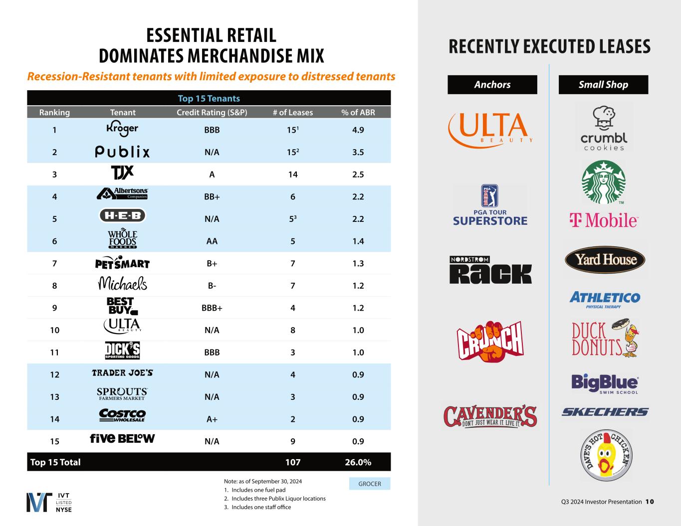Q3 2024 Investor Presentation 1 0 Note: as of September 30, 2024 1. Includes one fuel pad 2. Includes three Publix Liquor locations 3. Includes one staff office Top 15 Tenants Ranking Tenant Credit Rating (S&P) # of Leases % of ABR 1 BBB 151 4.9 2 N/A 152 3.5 3 A 14 2.5 4 BB+ 6 2.2 5 N/A 53 2.2 6 AA 5 1.4 7 B+ 7 1.3 8 B- 7 1.2 9 BBB+ 4 1.2 10 N/A 8 1.0 11 BBB 3 1.0 12 N/A 4 0.9 13 N/A 3 0.9 14 A+ 2 0.9 15 N/A 9 0.9 Top 15 Total 107 26.0% GROCER ESSENTIAL RETAIL DOMINATES MERCHANDISE MIX Recession esistant tenants with limited exposure to distressed tenants RECENTLY EXECUTED LEASES Anchors Small Shop