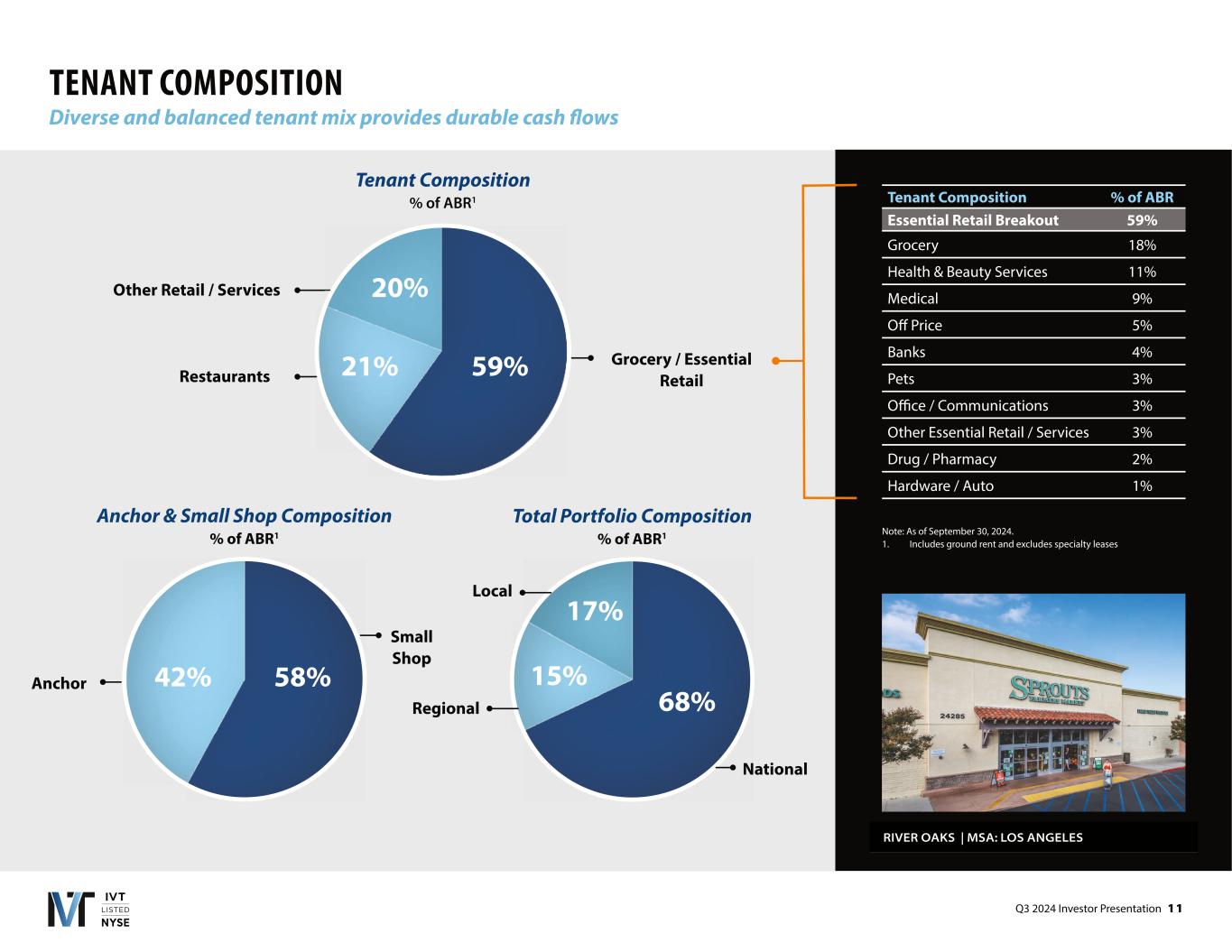 Q3 2024 Investor Presentation 1 1 TENANT COMPOSITION Diverse and balanced tenant mix provides durable cash flows Other Retail / Services Restaurants Grocery / Essential Retail Anchor & Small Shop Composition % of ABR1 42% 58%Anchor Small Shop Total Portfolio Composition % of ABR1 17% 15% 68% Local Regional National Tenant Composition % of ABR Essential Retail Breakout 59% Grocery 18% Health & Beauty Services 11% Medical 9% Off Price 5% Banks 4% Pets 3% Office / Communications 3% Other Essential Retail / Services 3% Drug / Pharmacy 2% Hardware / Auto 1% RIVER OAKS | MSA: LOS ANGELES Note: As of September 30, 2024. 1. Includes ground rent and excludes specialty leases Tenant Composition % of ABR1 20% 21% 59%