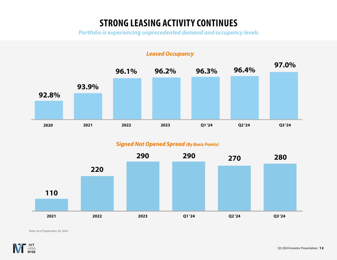 Q3 2024 Investor Presentation 1 2 STRONG LEASING ACTIVITY CONTINUES Portfolio is experiencing unprecedented demand and occupancy levels 92.8% 93.9% 96.1% 96.2% 96.3% 96.4% 2020 2021 2022 2023 Q1 ‘24 Leased Occupancy Signed Not Opened Spread By Basis Points 2021 2022 2023 Q1 ‘24 Q2 ‘24 110 220 290 290 270 Note: As of September 30, 2024 Q2 ‘24 Q3 ‘24 97.0% Q3 ‘24 280