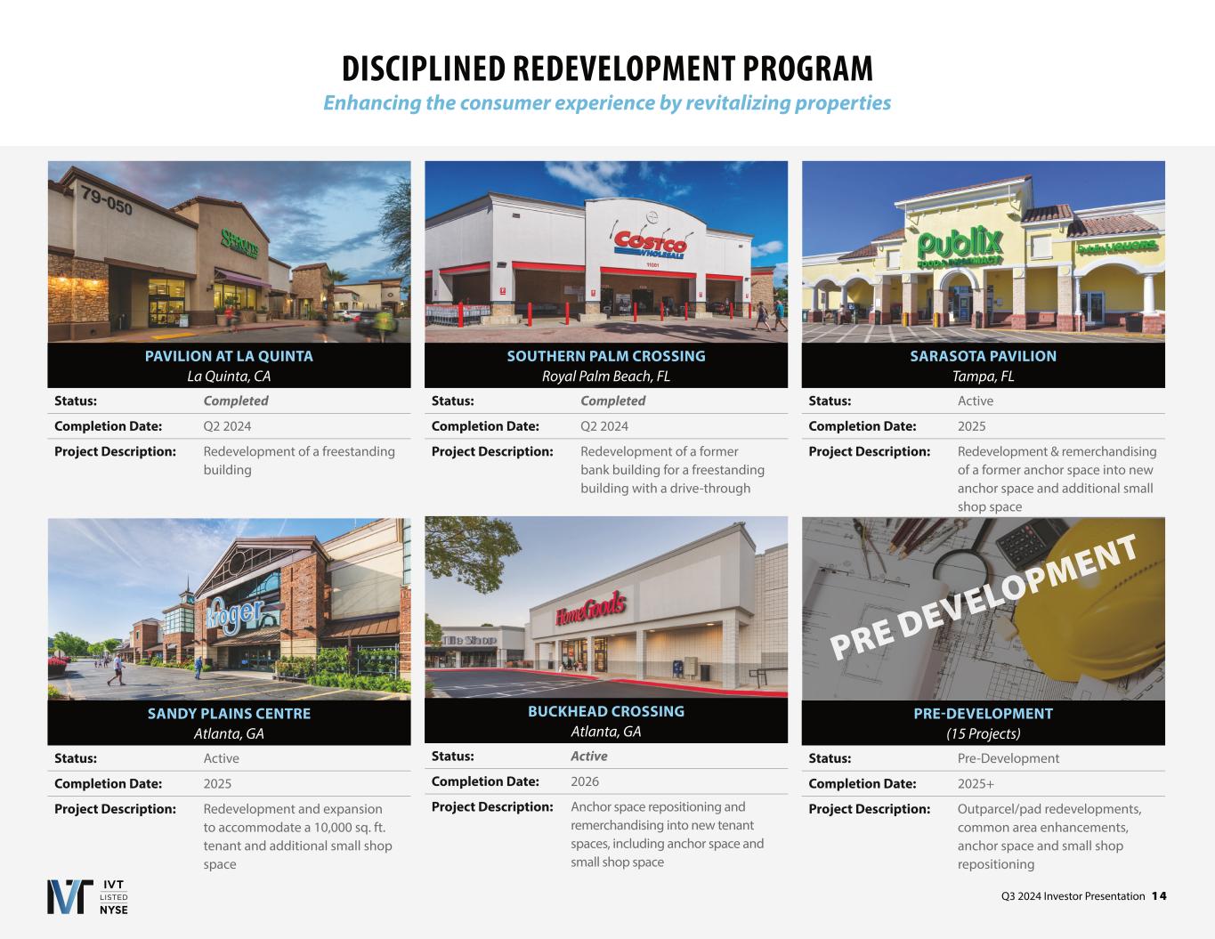 Q3 2024 Investor Presentation 1 4 SARASOTA PAVILION Tampa, FL Status: Active Completion Date: 2025 Project Description: Redevelopment & remerchandising of a former anchor space into new anchor space and additional small shop space DISCIPLINED REDEVELOPMENT PROGRAM Enhancing the consumer experience by revitalizing properties PAVILION AT LA QUINTA La Quinta, CA Status: Completed Completion Date: Q2 2024 Project Description: Redevelopment of a freestanding building SOUTHERN PALM CROSSING Royal Palm Beach, FL Status: Completed Completion Date: Q2 2024 Project Description: Redevelopment of a former bank building for a freestanding building with a drive-through BUCKHEAD CROSSING Atlanta, GA Status: Active Completion Date: 2026 Project Description: Anchor space repositioning and remerchandising into new tenant spaces, including anchor space and small shop space SANDY PLAINS CENTRE Atlanta, GA Status: Active Completion Date: 2025 Project Description: Redevelopment and expansion to accommodate a 10,000 sq. ft. tenant and additional small shop space PRE-DEVELOPMENT (15 Projects) Status: Pre-Development Completion Date: 2025+ Project Description: Outparcel/pad redevelopments, common area enhancements, anchor space and small shop repositioning PRE DEVELOPMENT