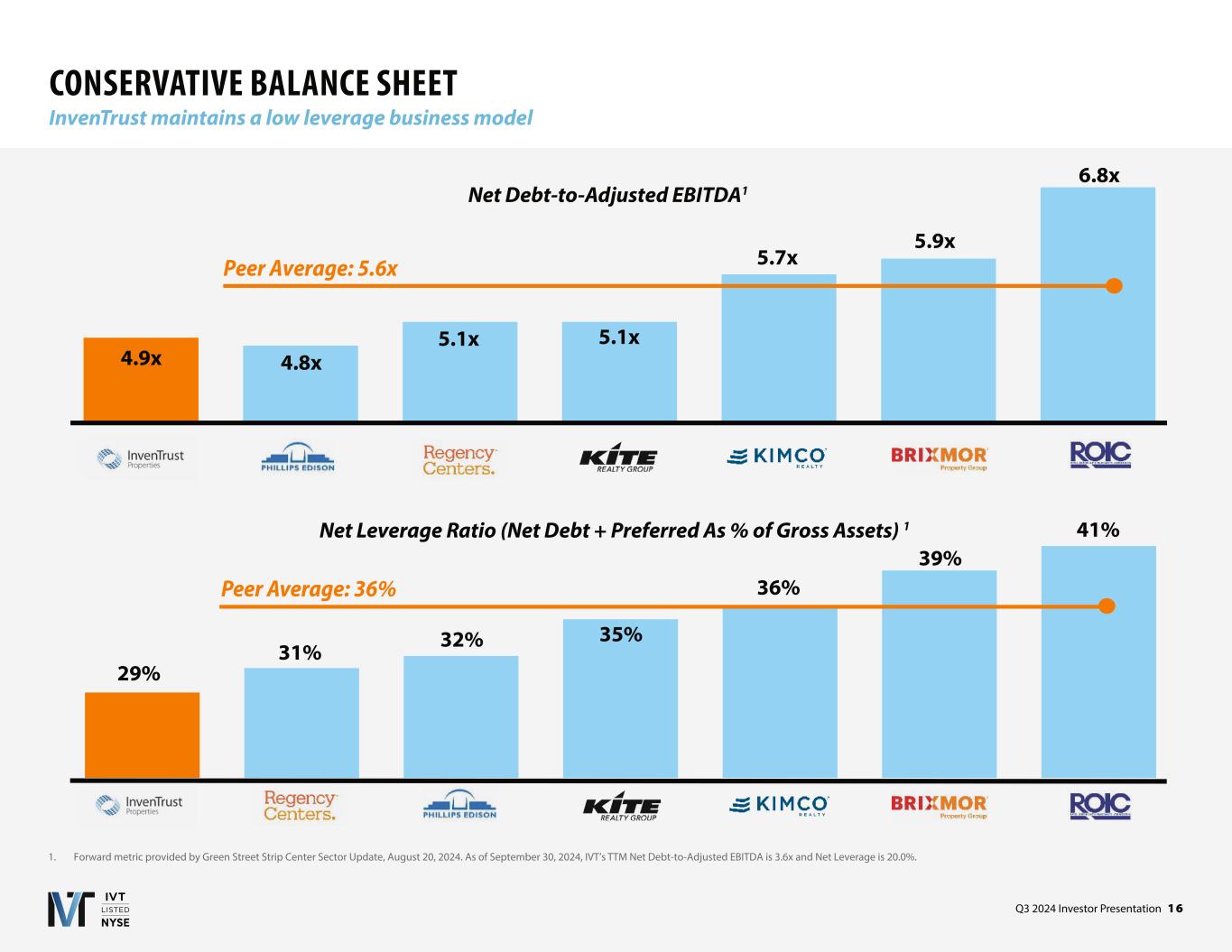 Q3 2024 Investor Presentation 1 6 CONSERVATIVE BALANCE SHEET InvenTrust maintains a low leverage business model Net Debt-to-Adjusted EBITDA1 Net Leverage Ratio (Net Debt + Preferred As % of Gross Assets) 1 1. Forward metric provided by Green Street Strip Center Sector Update, , 2024. As of September 30, 2024, IVT’s TTM Net Debt-to-Adjusted EBITDA is 3.6x and Net Leverage is 20.0%. Peer Average: 5.6x 36% 39% 41% 32% 31% 29% 4.9x 4.8x 5.1x 5.1x 5.7x 5.9x 6.8x Peer Average: 36% 35%