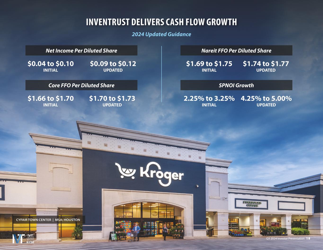 Q3 2024 Investor Presentation 1 8 INVENTRUST DELIVERS CASH FLOW GROWTH 2024 Updated Guidance $0.04 to $0.10 INITIAL CYFAIR TOWN CENTER | MSA: HOUSTON Net Income Per Diluted Share $0.09 to $0.12 UPDATED $1.69 to $1.75 INITIAL Nareit FFO Per Diluted Share $1.74 to $1.77 UPDATED $1.66 to $1.70 INITIAL Core FFO Per Diluted Share $1.70 to $1.73 UPDATED 2.25% to 3.25% INITIAL SPNOI Growth 4.25% to 5.00% UPDATED