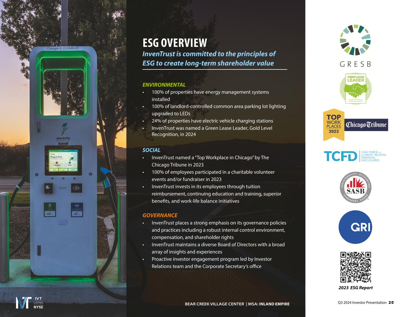 Q3 2024 Investor Presentation 2 0 ESG OVERVIEW InvenTrust is committed to the principles of ESG to create long-term shareholder value ENVIRONMENTAL • 100% of properties have energy management systems installed • 100% of landlord-controlled common area parking lot lighting upgraded to LEDs • 24% of properties have electric vehicle charging stations • InvenTrust was named a Green Lease Leader, Gold Level Recognition, in 2024 SOCIAL • InvenTrust named a “Top Workplace in Chicago” by The Chicago Tribune in 2023 • 100% of employees participated in a charitable volunteer events and/or fundraiser in 2023 • InvenTrust invests in its employees through tuition reimbursement, continuing education and training, superior benefits, and work-life balance initiatives GOVERNANCE • InvenTrust places a strong emphasis on its governance policies and practices including a robust internal control environment, compensation, and shareholder rights • InvenTrust maintains a diverse Board of Directors with a broad array of insights and experiences • Proactive investor engagement program led by Investor Relations team and the Corporate Secretary’s office BEAR CREEK VILLAGE CENTER | MSA: 2023 ESG Report