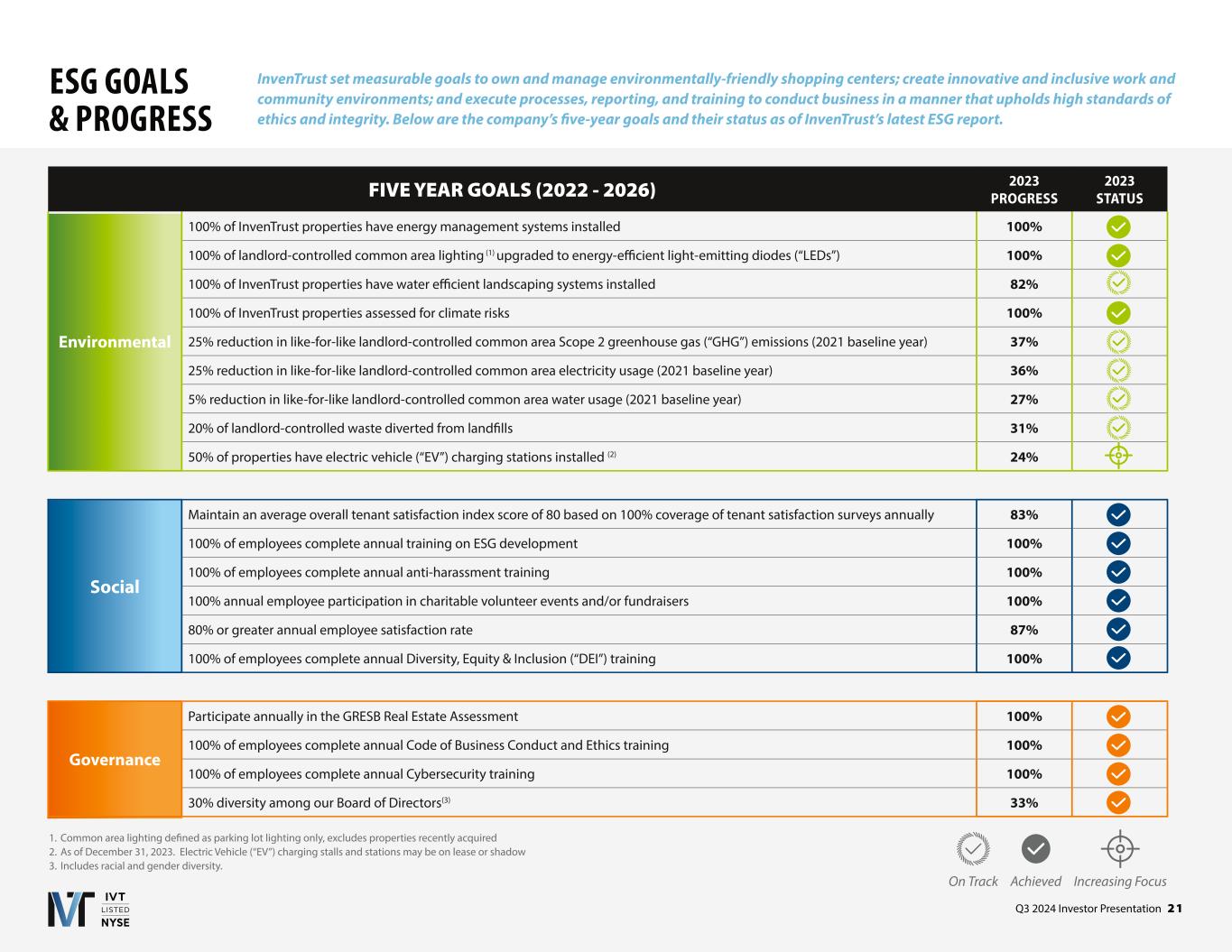 Q3 2024 Investor Presentation 2 1 ESG GOALS & PROGRESS InvenTrust set measurable goals to own and manage environmentally-friendly shopping centers; create innovative and inclusive work and community environments; and execute processes, reporting, and training to conduct business in a manner that upholds high standards of ethics and integrity. Below are the company’s five-year goals and their status as of InvenTrust’s latest ESG report. FIVE YEAR GOALS (2022 - 2026) 2023 PROGRESS 2023 STATUS Environmental 100% of InvenTrust properties have energy management systems installed 100% 100% of landlord-controlled common area lighting (1) upgraded to energy-efficient light-emitting diodes (“LEDs”) 100% 100% of InvenTrust properties have water efficient landscaping systems installed 82% 100% of InvenTrust properties assessed for climate risks 100% 25% reduction in like-for-like landlord-controlled common area Scope 2 greenhouse gas (“GHG”) emissions (2021 baseline year) 37% 25% reduction in like-for-like landlord-controlled common area electricity usage (2021 baseline year) 36% 5% reduction in like-for-like landlord-controlled common area water usage (2021 baseline year) 27% 20% of landlord-controlled waste diverted from landfills 31% 50% of properties have electric vehicle (“EV”) charging stations installed (2) 24% Social Maintain an average overall tenant satisfaction index score of 80 based on 100% coverage of tenant satisfaction surveys annually 83% 100% of employees complete annual training on ESG development 100% 100% of employees complete annual anti-harassment training 100% 100% annual employee participation in charitable volunteer events and/or fundraisers 100% 80% or greater annual employee satisfaction rate 87% 100% of employees complete annual Diversity, Equity & Inclusion (“DEI”) training 100% Governance Participate annually in the GRESB Real Estate Assessment 100% 100% of employees complete annual Code of Business Conduct and Ethics training 100% 100% of employees complete annual Cybersecurity training 100% 30% diversity among our Board of Directors(3) 33% On Track Achieved Increasing Focus 1. Common area lighting defined as parking lot lighting only, excludes properties recently acquired 2. As of December 31, 2023. Electric Vehicle (“EV”) charging stalls and stations may be on lease or shadow 3. Includes racial and gender diversity.
