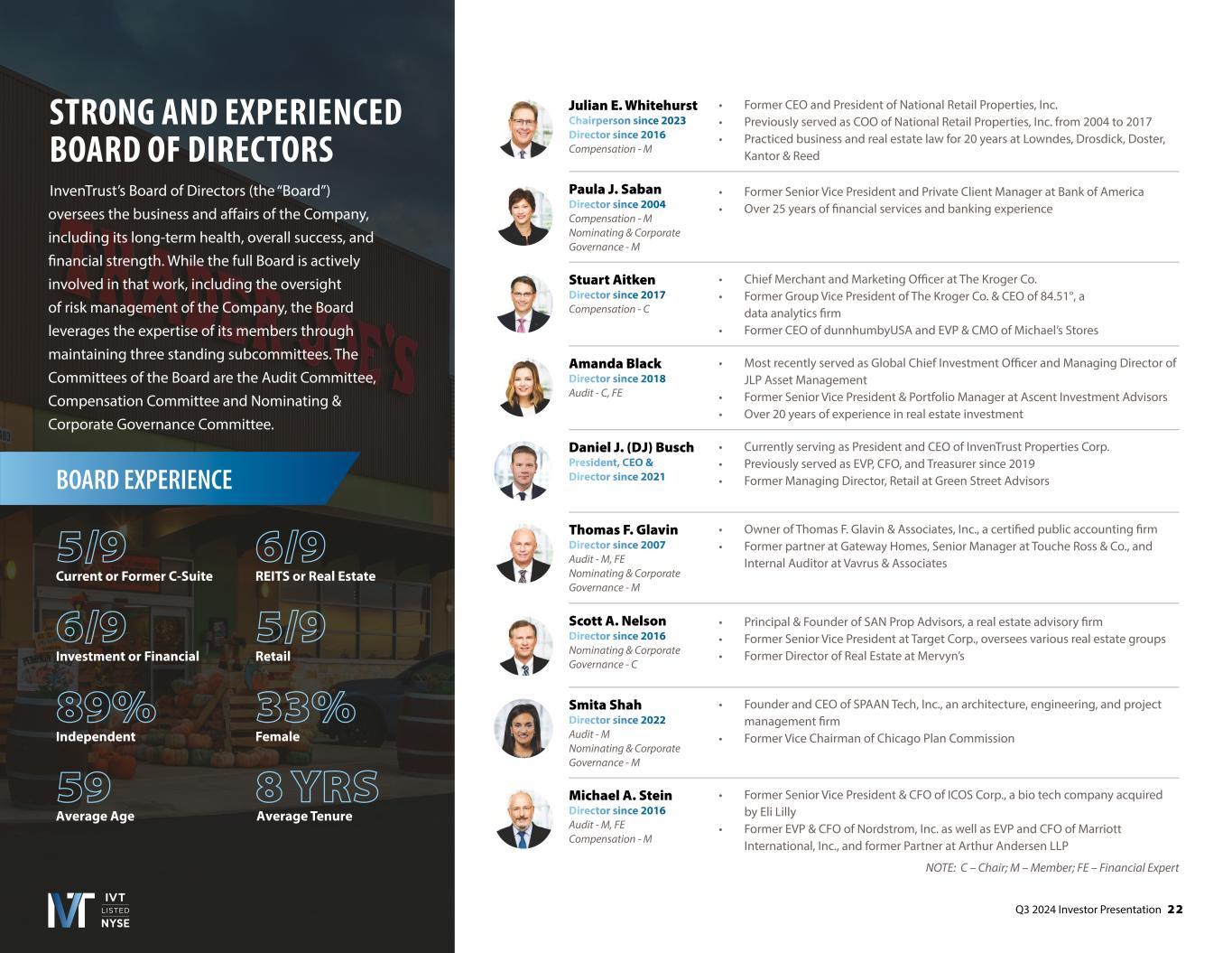 Q3 2024 Investor Presentation 2 2 Amanda Black Director since 2018 Audit - C, FE • Most recently served as Global Chief Investment Officer and Managing Director of JLP Asset Management • Former Senior Vice President & Portfolio Manager at Ascent Investment Advisors • Over 20 years of experience in real estate investment Stuart Aitken Director since 2017 Compensation - C • Chief Merchant and Marketing Officer at The Kroger Co. • Former Group Vice President of The Kroger Co. & CEO of 84.51°, a data analytics firm • Former CEO of dunnhumbyUSA and EVP & CMO of Michael’s Stores NOTE: C – Chair; M – Member; FE – Financial Expert Paula J. Saban Director since 2004 Compensation - M Nominating & Corporate Governance - M • Former Senior Vice President and Private Client Manager at Bank of America • Over 25 years of financial services and banking experience Thomas F. Glavin Director since 2007 Audit - M, FE Nominating & Corporate Governance - M • Owner of Thomas F. Glavin & Associates, Inc., a certified public accounting firm • Former partner at Gateway Homes, Senior Manager at Touche Ross & Co., and Internal Auditor at Vavrus & Associates Scott A. Nelson Director since 2016 Nominating & Corporate Governance - C • Principal & Founder of SAN Prop Advisors, a real estate advisory firm • Former Senior Vice President at Target Corp., oversees various real estate groups • Former Director of Real Estate at Mervyn’s Daniel J. (DJ) Busch President, CEO & Director since 2021 • Currently serving as President and CEO of InvenTrust Properties Corp. • Previously served as EVP, CFO, and Treasurer since 2019 • Former Managing Director, Retail at Green Street Advisors Julian E. Whitehurst Chairperson since 2023 Director since 2016 Compensation - M • Former CEO and President of National Retail Properties, Inc. • Previously served as COO of National Retail Properties, Inc. from 2004 to 2017 • Practiced business and real estate law for 20 years at Lowndes, Drosdick, Doster, Kantor & Reed Michael A. Stein Director since 2016 Audit - M, FE Compensation - M • Former Senior Vice President & CFO of ICOS Corp., a bio tech company acquired by Eli Lilly • Former EVP & CFO of Nordstrom, Inc. as well as EVP and CFO of Marriott International, Inc., and former Partner at Arthur Andersen LLP Smita Shah Director since 2022 Audit - M Nominating & Corporate Governance - M • Founder and CEO of SPAAN Tech, Inc., an architecture, engineering, and project management firm • Former Vice Chairman of Chicago Plan Commission InvenTrust’s Board of Directors (the “Board”) oversees the business and affairs of the Company, including its long-term health, overall success, and financial strength. While the full Board is actively involved in that work, including the oversight of risk management of the Company, the Board leverages the expertise of its members through maintaining three standing subcommittees. The Committees of the Board are the Audit Committee, Compensation Committee and Nominating & Corporate Governance Committee. BOARD EXPERIENCE 5/9 Current or Former C-Suite 89% Independent 6/9 Investment or Financial 59 5/9 Retail 6/9 REITS or Real Estate 33% Female 8 YRS STRONG AND EXPERIENCED BOARD OF DIRECTORS Average Age Average Tenure