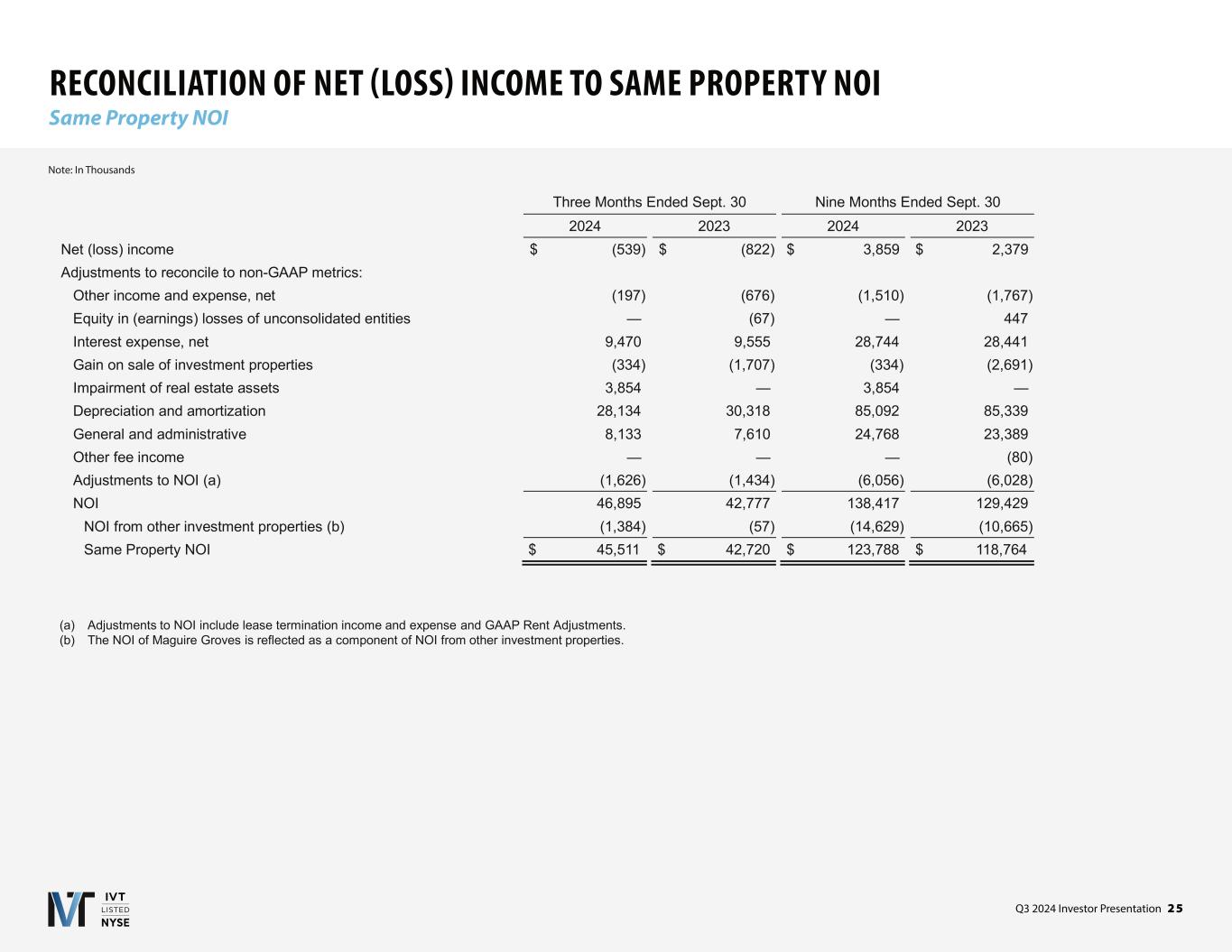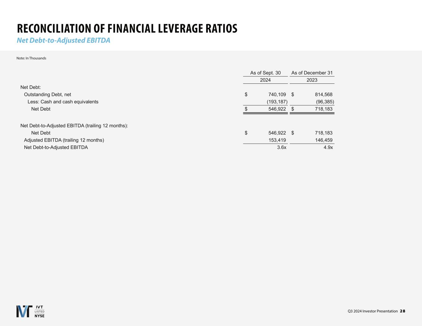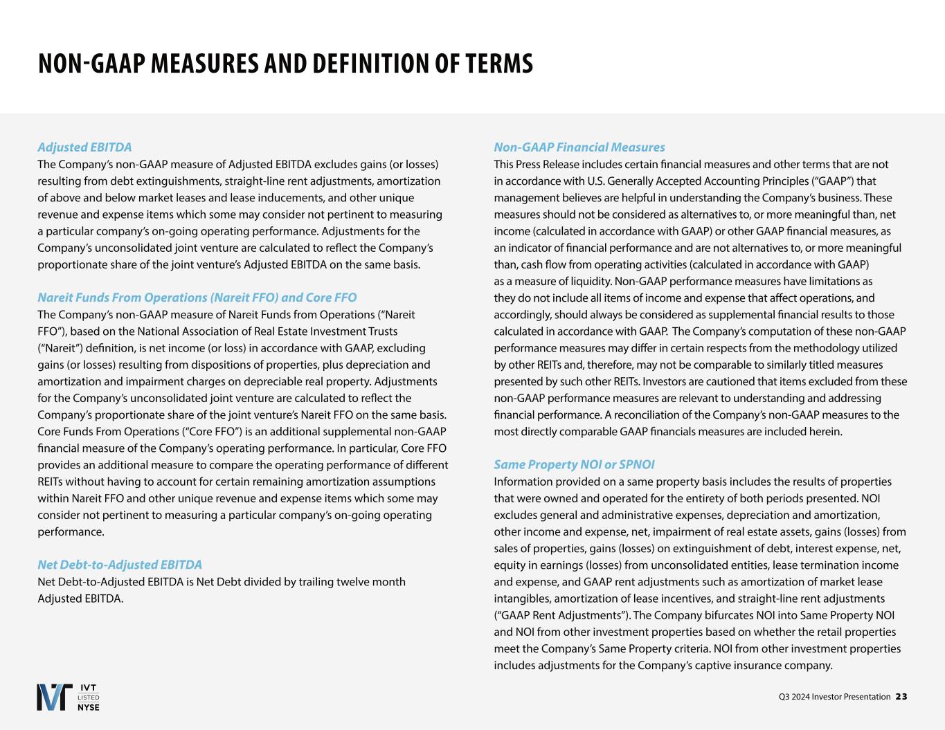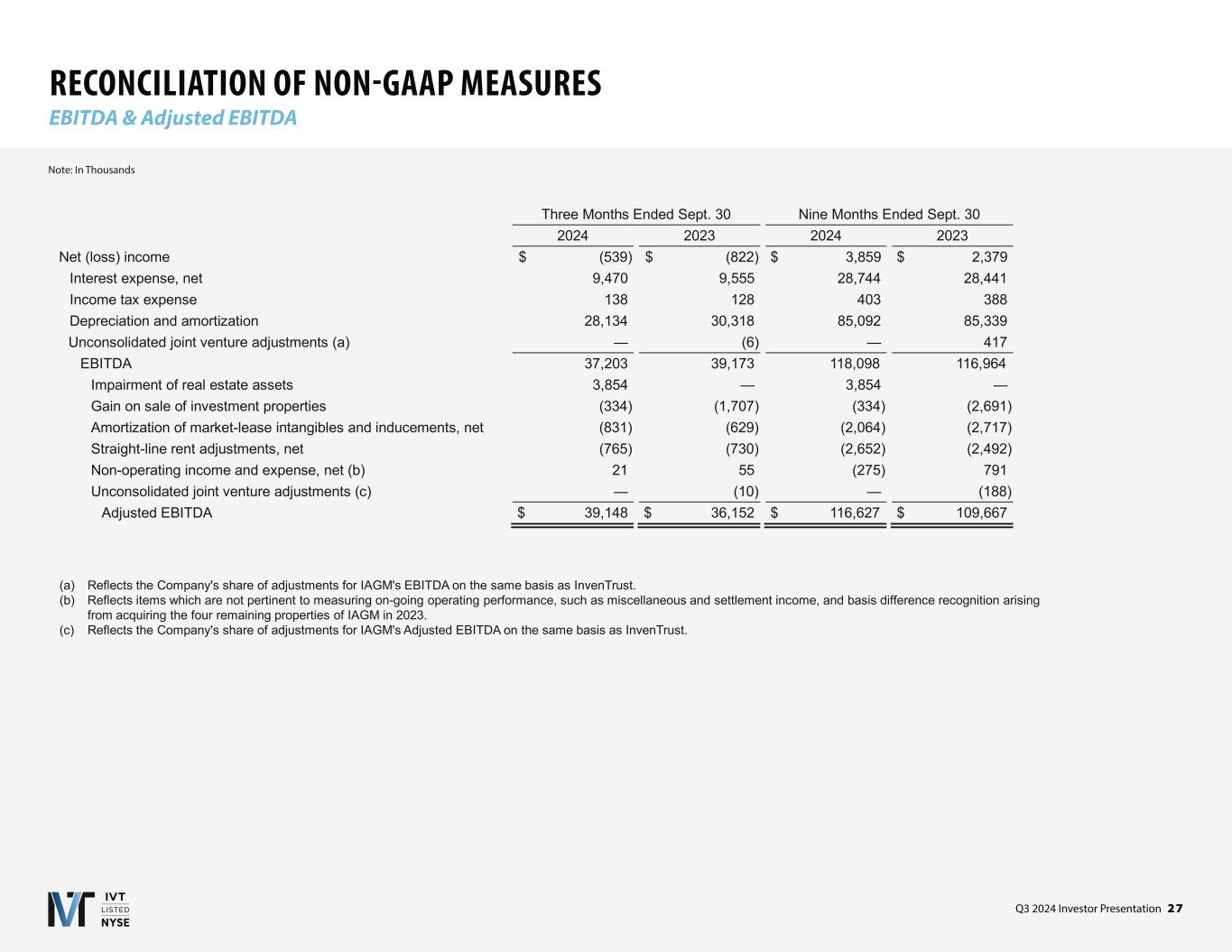 Q3 2024 Investor Presentation 2 7 RECONCILIATION OF NON-GAAP MEASURES EBITDA & Adjusted EBITDA Note: In Thousands (a) Reflects the Company's share of adjustments for IAGM's EBITDA on the same basis as InvenTrust. (b) Reflects items which are not pertinent to measuring on-going operating performance, such as miscellaneous and settlement income, and basis difference recognition arising from acquiring the four remaining properties of IAGM in 2023. (c) Reflects the Company's share of adjustments for IAGM's Adjusted EBITDA on the same basis as InvenTrust. Three Months Ended Sept. 30 Nine Months Ended Sept. 30 2024 2023 2024 2023 Net (loss) income $ (539) $ (822) $ 3,859 $ 2,379 Interest expense, net 9,470 9,555 28,744 28,441 Income tax expense 138 128 403 388 Depreciation and amortization 28,134 30,318 85,092 85,339 Unconsolidated joint venture adjustments (a) — (6) — 417 EBITDA 37,203 39,173 118,098 116,964 Impairment of real estate assets 3,854 — 3,854 — Gain on sale of investment properties (334) (1,707) (334) (2,691) Amortization of market-lease intangibles and inducements, net (831) (629) (2,064) (2,717) Straight-line rent adjustments, net (765) (730) (2,652) (2,492) Non-operating income and expense, net (b) 21 55 (275) 791 Unconsolidated joint venture adjustments (c) — (10) — (188) Adjusted EBITDA $ 39,148 $ 36,152 $ 116,627 $ 109,667
