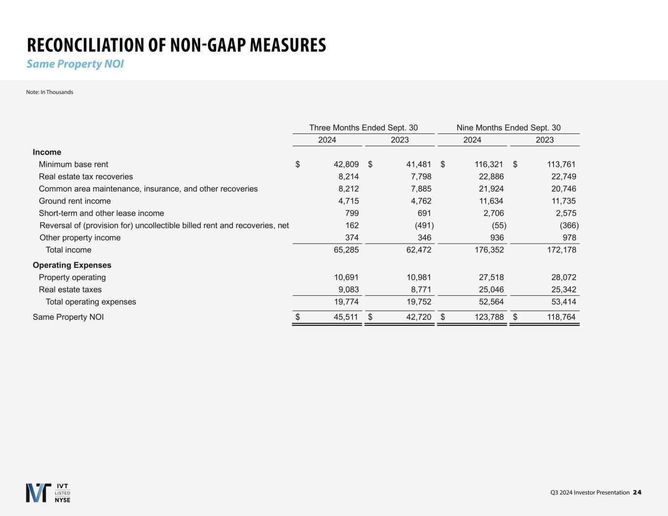 Q3 2024 Investor Presentation 2 4 RECONCILIATION OF NON-GAAP MEASURES Same Property NOI Note: In Thousands Three Months Ended Sept. 30 Nine Months Ended Sept. 30 2024 2023 2024 2023 Income Minimum base rent $ 42,809 $ 41,481 $ 116,321 $ 113,761 Real estate tax recoveries 8,214 7,798 22,886 22,749 Common area maintenance, insurance, and other recoveries 8,212 7,885 21,924 20,746 Ground rent income 4,715 4,762 11,634 11,735 Short-term and other lease income 799 691 2,706 2,575 Reversal of (provision for) uncollectible billed rent and recoveries, net 162 (491) (55) (366) Other property income 374 346 936 978 Total income 65,285 62,472 176,352 172,178 Operating Expenses Property operating 10,691 10,981 27,518 28,072 Real estate taxes 9,083 8,771 25,046 25,342 Total operating expenses 19,774 19,752 52,564 53,414 Same Property NOI $ 45,511 $ 42,720 $ 123,788 $ 118,764