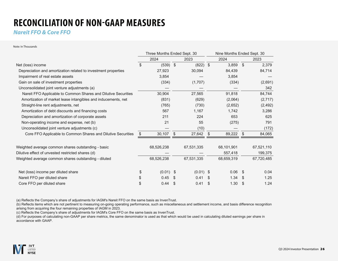 Q3 2024 Investor Presentation 2 6 RECONCILIATION OF NON-GAAP MEASURES Nareit FFO & Core FFO Note: In Thousands (a) Reflects the Company’s share of adjustments for IAGM's Nareit FFO on the same basis as InvenTrust. (b) Reflects items which are not pertinent to measuring on-going operating performance, such as miscellaneous and settlement income, and basis difference recognition arising from acquiring the four remaining properties of IAGM in 2023. (c) Reflects the Company’s share of adjustments for IAGM's Core FFO on the same basis as InvenTrust. (d) For purposes of calculating non-GAAP per share metrics, the same denominator is used as that which would be used in calculating diluted earnings per share in accordance with GAAP. Three Months Ended Sept. 30 Nine Months Ended Sept. 30 2024 2023 2024 2023 Net (loss) income $ (539) $ (822) $ 3,859 $ 2,379 Depreciation and amortization related to investment properties 27,923 30,094 84,439 84,714 Impairment of real estate assets 3,854 — 3,854 — Gain on sale of investment properties (334) (1,707) (334) (2,691) Unconsolidated joint venture adjustments (a) — — — 342 Nareit FFO Applicable to Common Shares and Dilutive Securities 30,904 27,565 91,818 84,744 Amortization of market lease intangibles and inducements, net (831) (629) (2,064) (2,717) Straight-line rent adjustments, net (765) (730) (2,652) (2,492) Amortization of debt discounts and financing costs 567 1,167 1,742 3,286 Depreciation and amortization of corporate assets 211 224 653 625 Non-operating income and expense, net (b) 21 55 (275) 791 Unconsolidated joint venture adjustments (c) — (10) — (172) Core FFO Applicable to Common Shares and Dilutive Securities $ 30,107 $ 27,642 $ 89,222 $ 84,065 Weighted average common shares outstanding - basic 68,526,238 67,531,335 68,101,901 67,521,110 Dilutive effect of unvested restricted shares (d) — — 557,418 199,375 Weighted average common shares outstanding - diluted 68,526,238 67,531,335 68,659,319 67,720,485 Net (loss) income per diluted share $ (0.01) $ (0.01) $ 0.06 $ 0.04 Nareit FFO per diluted share $ 0.45 $ 0.41 $ 1.34 $ 1.25 Core FFO per diluted share $ 0.44 $ 0.41 $ 1.30 $ 1.24