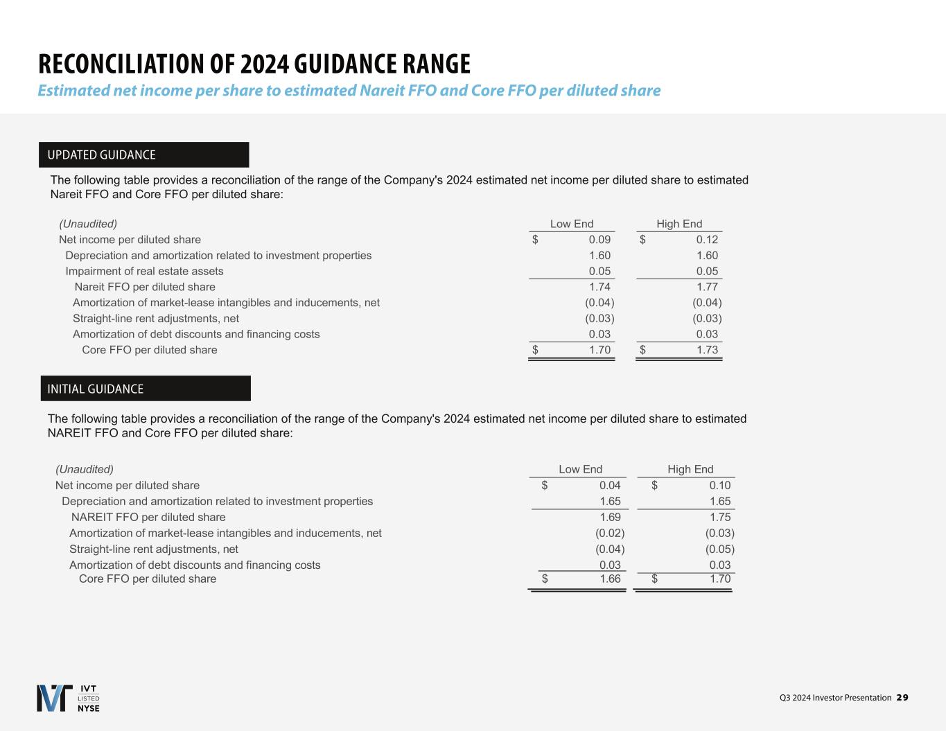 Q3 2024 Investor Presentation 2 9 RECONCILIATION OF 2024 GUIDANCE RANGE Estimated net income per share to estimated Nareit FFO and Core FFO per diluted share The following table provides a reconciliation of the range of the Company's 2024 estimated net income per diluted share to estimated Nareit FFO and Core FFO per diluted share: (Unaudited) Low End High End Net income per diluted share $ 0.09 $ 0.12 Depreciation and amortization related to investment properties 1.60 1.60 Impairment of real estate assets 0.05 0.05 Nareit FFO per diluted share 1.74 1.77 Amortization of market-lease intangibles and inducements, net (0.04) (0.04) Straight-line rent adjustments, net (0.03) (0.03) Amortization of debt discounts and financing costs 0.03 0.03 Core FFO per diluted share $ 1.70 $ 1.73 (Unaudited) Low End High End Net income per diluted share $ 0.04 $ 0.10 Depreciation and amortization related to investment properties 1.65 1.65 NAREIT FFO per diluted share 1.69 1.75 Amortization of market-lease intangibles and inducements, net (0.02) (0.03) Straight-line rent adjustments, net (0.04) (0.05) Amortization of debt discounts and financing costs 0.03 0.03 Core FFO per diluted share $ 1.66 $ 1.70 UPDATED GUIDANCE INITIAL GUIDANCE