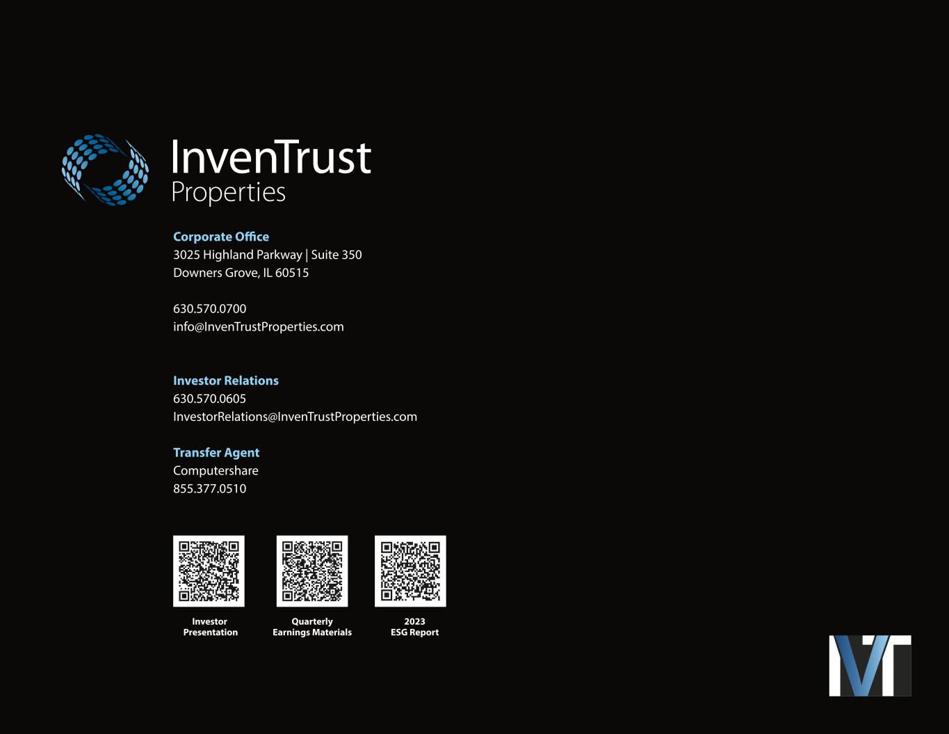 Corporate Office 3025 Highland Parkway | Suite 350 Downers Grove, IL 60515 630.570.0700 info@InvenTrustProperties.com Investor Relations 630.570.0605 InvestorRelations@InvenTrustProperties.com Transfer Agent Computershare 855.377.0510 Investor Presentation Quarterly Earnings Materials 2023 ESG Report