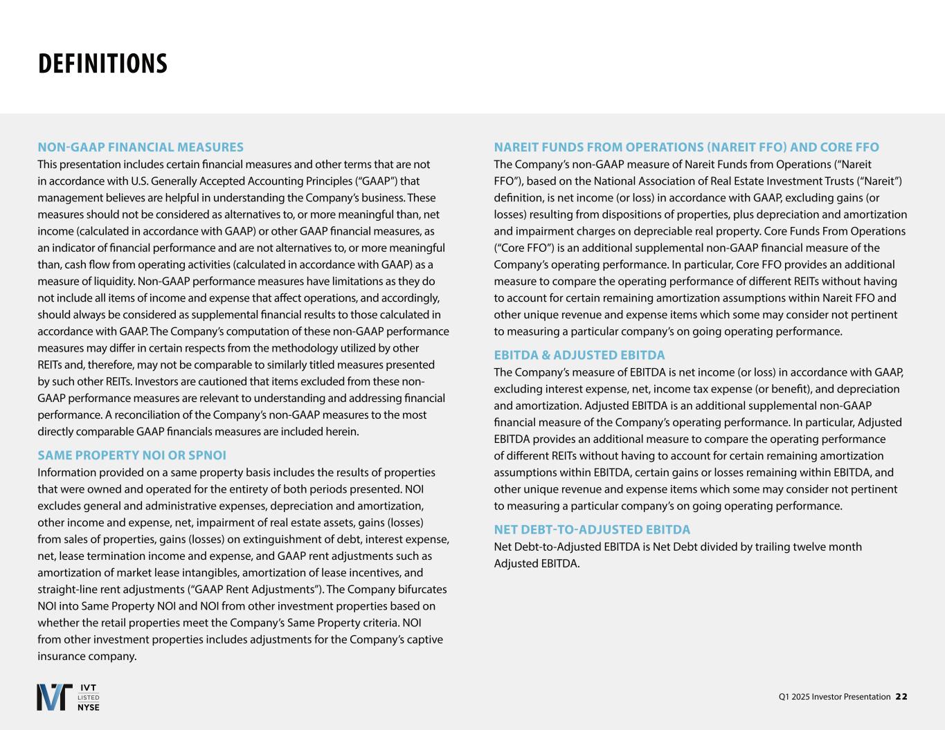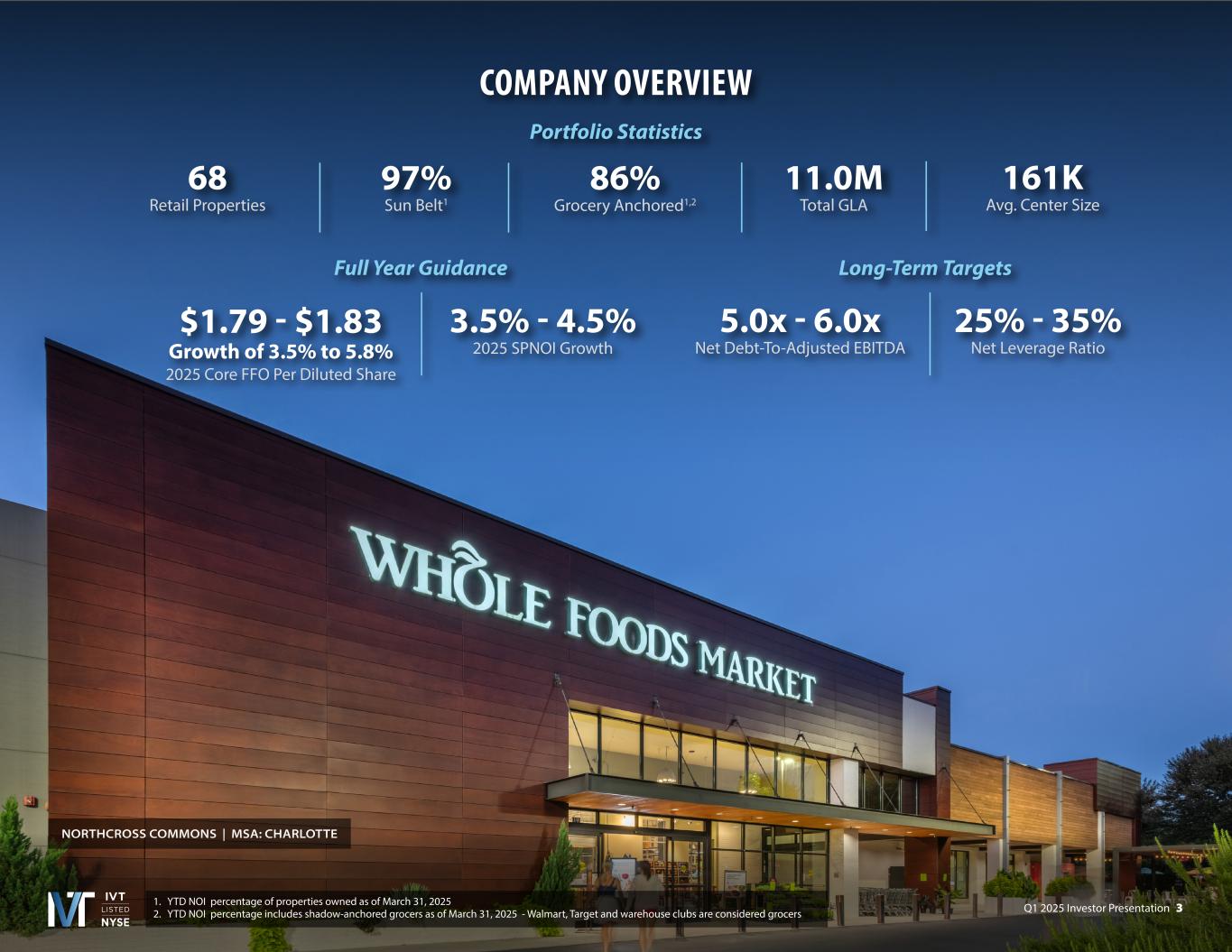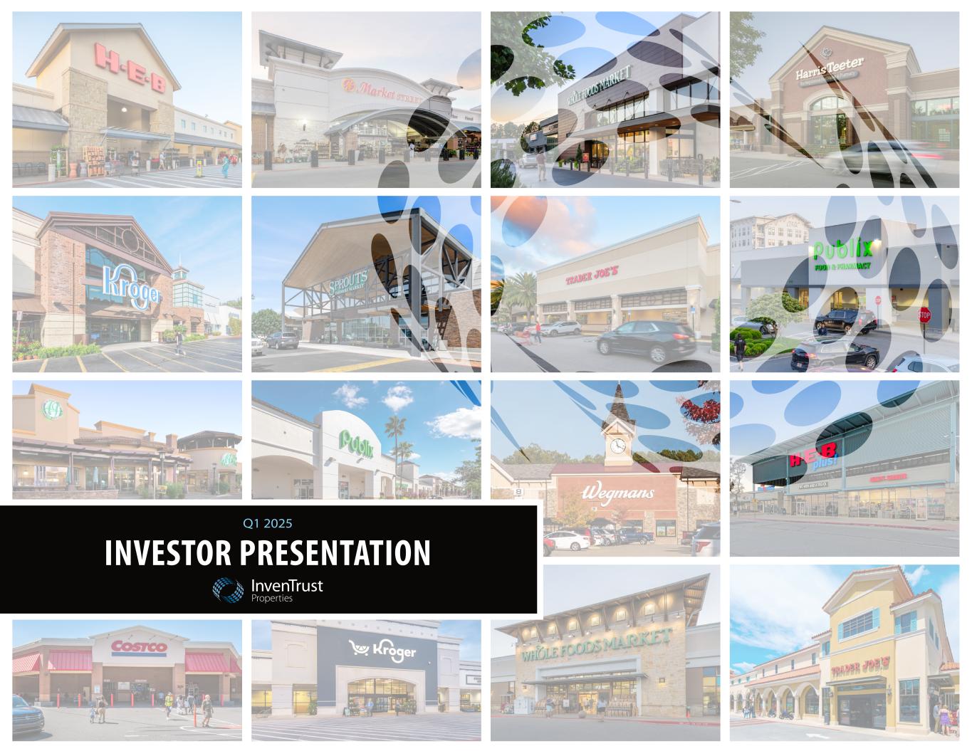 Q1 2025 Investor Presentation 2 INTRODUCTORY NOTES Forward-Looking Statements Disclaimer Forward-Looking Statements in this presentation, which are not historical facts, are forward-looking statements within the meaning of the Private Securities Litigation Reform Act of 1995. These statements are based on the current beliefs and expectations of InvenTrust’s management and are subject to significant risks and uncertainties. Actual results may differ materially from those described in the forward-looking statements. Any statements made in this supplemental that are not statements of historical fact, including statements about our beliefs and expectations, are forward-looking statements. Forward-looking statements include information concerning possible or assumed future results of operations, including our guidance and descriptions of our business plans and strategies. These statements often include words such as “may,” “should,” “could,” “would,” “expect,” “intend,” “plan,” “seek,” “anticipate,” “believe,” “estimate,” “target,” “project,” “predict,” “potential,” “continue,” “likely,” “will,” “forecast,” “outlook,” “guidance,” “suggest,” and variations of these terms and similar expressions, or the negative of these terms or similar expressions. The following factors, among others, could cause actual results, financial position and timing of certain events to differ materially from those described in the forward-looking statements: interest rate movements; local, regional, national and global economic performance; the impact of inflation on the Company and on its tenants; competitive factors; the impact of e-commerce on the retail industry; future retailer store closings; retailer consolidation; retailers reducing store size; retailer bankruptcies; government policy changes, including the effects of recent new tariffs and changes in global trade policies on the overall state of the economy; and any material market changes and trends that could affect the Company’s business strategy. For further discussion of factors that could materially affect the outcome of management’s forward-looking statements and IVT’s future results and financial condition, see the Risk Factors included in the Company’s most recent Annual Report on Form 10-K, as updated by any subsequent Quarterly Report on Form 10-Q, in each case as filed with the SEC. InvenTrust intends that such forward-looking statements be subject to the safe harbors created by Section 27A of the Securities Act of 1933, as amended, and Section 21E of the Securities Exchange Act of 1934, as amended, except as may be required by applicable law. IVT cautions you not to place undue reliance on any forward-looking statements, which are made as of the date of this presentation. IVT undertakes no obligation to update publicly any of these forward-looking statements to reflect actual results, new information or future events, changes in assumptions or changes in other factors affecting forward-looking statements, except to the extent required by applicable laws. If IVT updates one or more forward-looking statements, no inference should be drawn that IVT will make additional updates with respect to those or other forward-looking statements. Trademarks The companies depicted in the photographs herein, or any third-party trademarks, including names, logos and brands, referenced by the Company in this presentation, are the property of their respective owners. All references to third-party trademarks are for identification purposes only and nothing herein shall be considered to be an endorsement, authorization or approval of InvenTrust Properties Corp. by the companies. Further, none of these companies are affiliated with the Company in any manner.