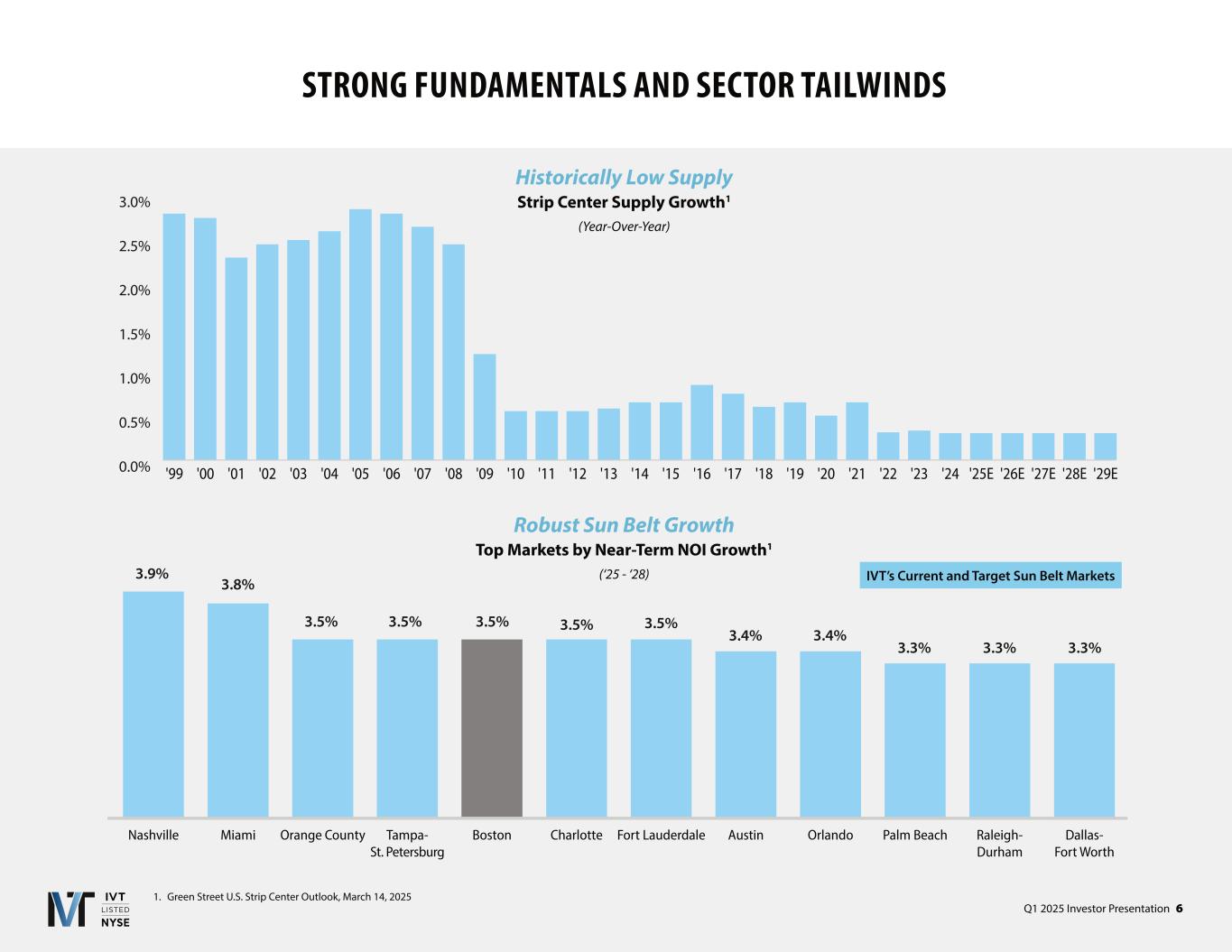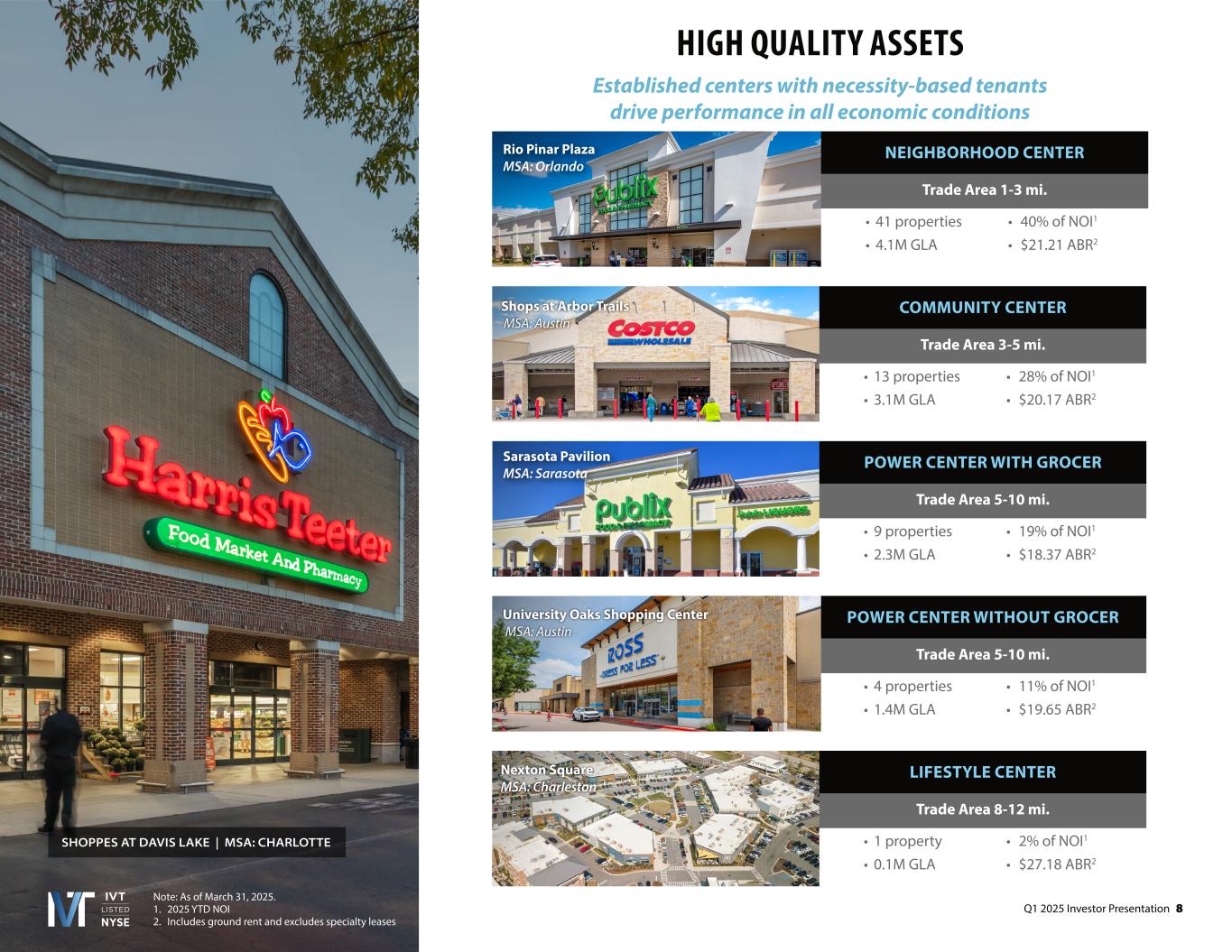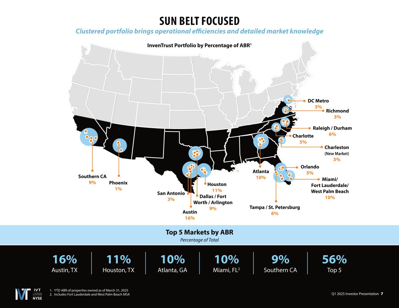 Q1 2025 Investor Presentation 6 STRONG FUNDAMENTALS AND SECTOR TAILWINDS 1. Green Street U.S. Strip Center Outlook, March 14, 2025 0.0 0.5 1.0 1.5 2.0 2.5 3.0 '29E'28E'27E'26E'25E'24'23'22'21'20'19'18'17'16'15'14'13'12'11'10'09'08'07'06'05'04'03'02'01'00'990.0% 0.5% 1.5% 2.5% 1.0% 2.0% 3.0% IVT’s Current and Target Sun Belt Markets Dallas- Fort Worth Raleigh- Durham Palm BeachOrlandoAustinFort LauderdaleCharlotteBostonTampa- St. Petersburg Orange CountyMiamiNashville 3.9% 3.8% 3.5% 3.5% 3.5% 3.5% 3.4% 3.4% 3.3% 3.5% 3.3% 3.3% Historically Low Supply Strip Center Supply Growth1 (Year-Over-Year) Robust Sun Belt Growth Top Markets by Near-Term NOI Growth1 (‘25 - ‘28)