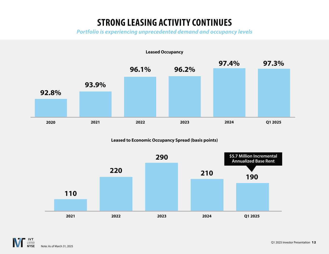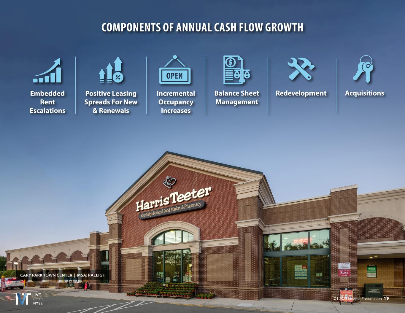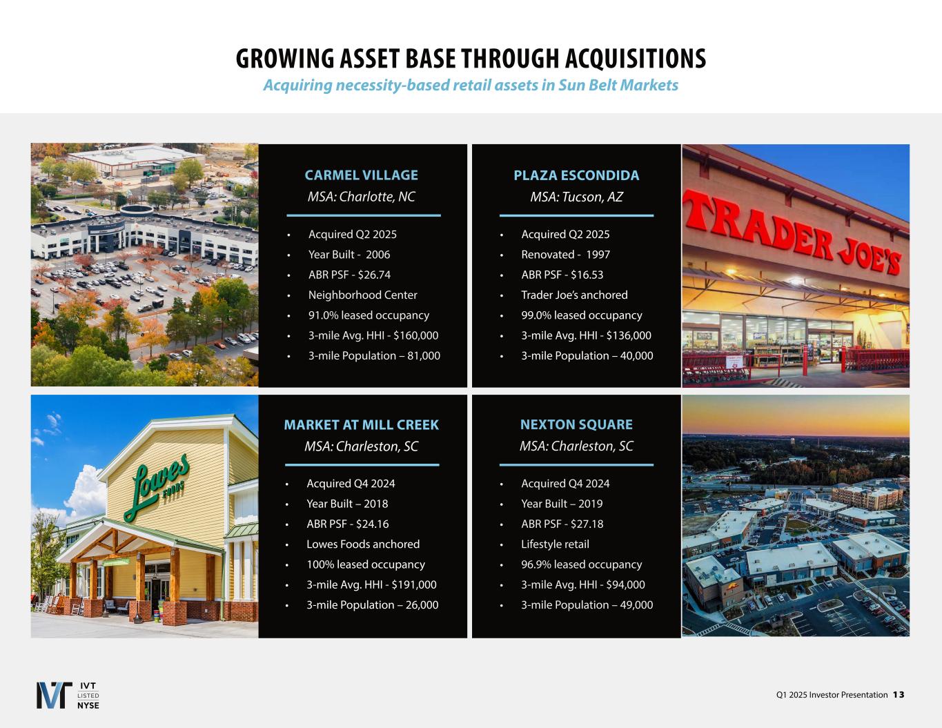Q1 2025 Investor Presentation 6 STRONG FUNDAMENTALS AND SECTOR TAILWINDS 1. Green Street U.S. Strip Center Outlook, March 14, 2025 0.0 0.5 1.0 1.5 2.0 2.5 3.0 '29E'28E'27E'26E'25E'24'23'22'21'20'19'18'17'16'15'14'13'12'11'10'09'08'07'06'05'04'03'02'01'00'990.0% 0.5% 1.5% 2.5% 1.0% 2.0% 3.0% IVT’s Current and Target Sun Belt Markets Dallas- Fort Worth Raleigh- Durham Palm BeachOrlandoAustinFort LauderdaleCharlotteBostonTampa- St. Petersburg Orange CountyMiamiNashville 3.9% 3.8% 3.5% 3.5% 3.5% 3.5% 3.4% 3.4% 3.3% 3.5% 3.3% 3.3% Historically Low Supply Strip Center Supply Growth1 (Year-Over-Year) Robust Sun Belt Growth Top Markets by Near-Term NOI Growth1 (‘25 - ‘28)