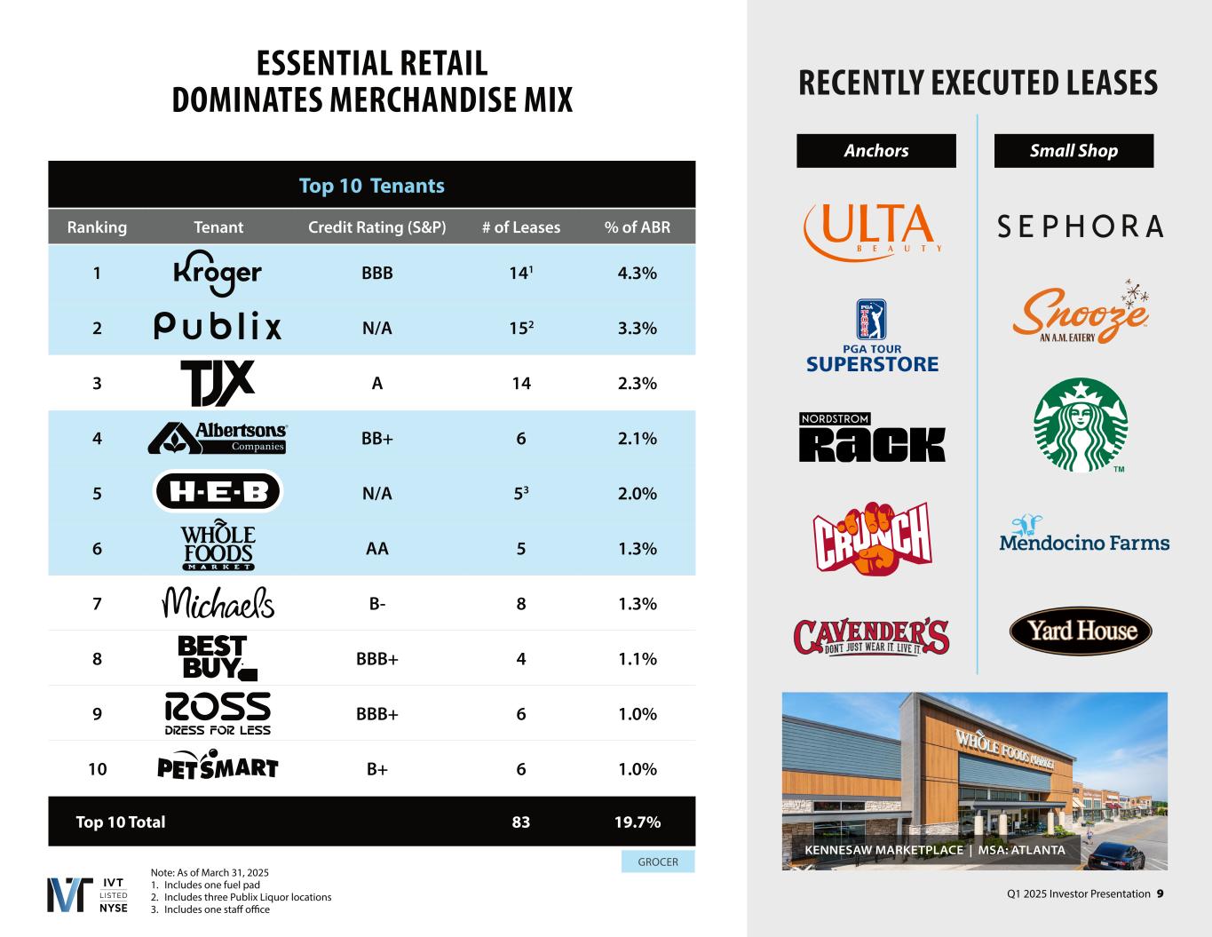 Q1 2025 Investor Presentation 8 POWER CENTER WITH GROCER Trade Area 5-10 mi. • 9 properties • 2.3M GLA • 19% of NOI1 • $18.37 ABR2 Sarasota Pavilion MSA: Sarasota SHOPPES AT DAVIS LAKE | MSA: CHARLOTTE HIGH QUALITY ASSETS Established centers with necessity-based tenants drive performance in all economic conditions Note: As of March 31, 2025. 1. 2025 YTD NOI 2. Includes ground rent and excludes specialty leases POWER CENTER WITHOUT GROCER Trade Area 5-10 mi. • 4 properties • 1.4M GLA • 11% of NOI1 • $19.65 ABR2 COMMUNITY CENTER Trade Area 3-5 mi. • 13 properties • 3.1M GLA • 28% of NOI1 • $20.17 ABR2 Shops at Arbor Trails MSA: Austin NEIGHBORHOOD CENTER Trade Area 1-3 mi. • 41 properties • 4.1M GLA • 40% of NOI1 • $21.21 ABR2 LIFESTYLE CENTER Trade Area 8-12 mi. • 1 property • 0.1M GLA • 2% of NOI1 • $27.18 ABR2 Nexton Square MSA: Charleston University Oaks Shopping Center MSA: Austin Rio Pinar Plaza MSA: Orlando