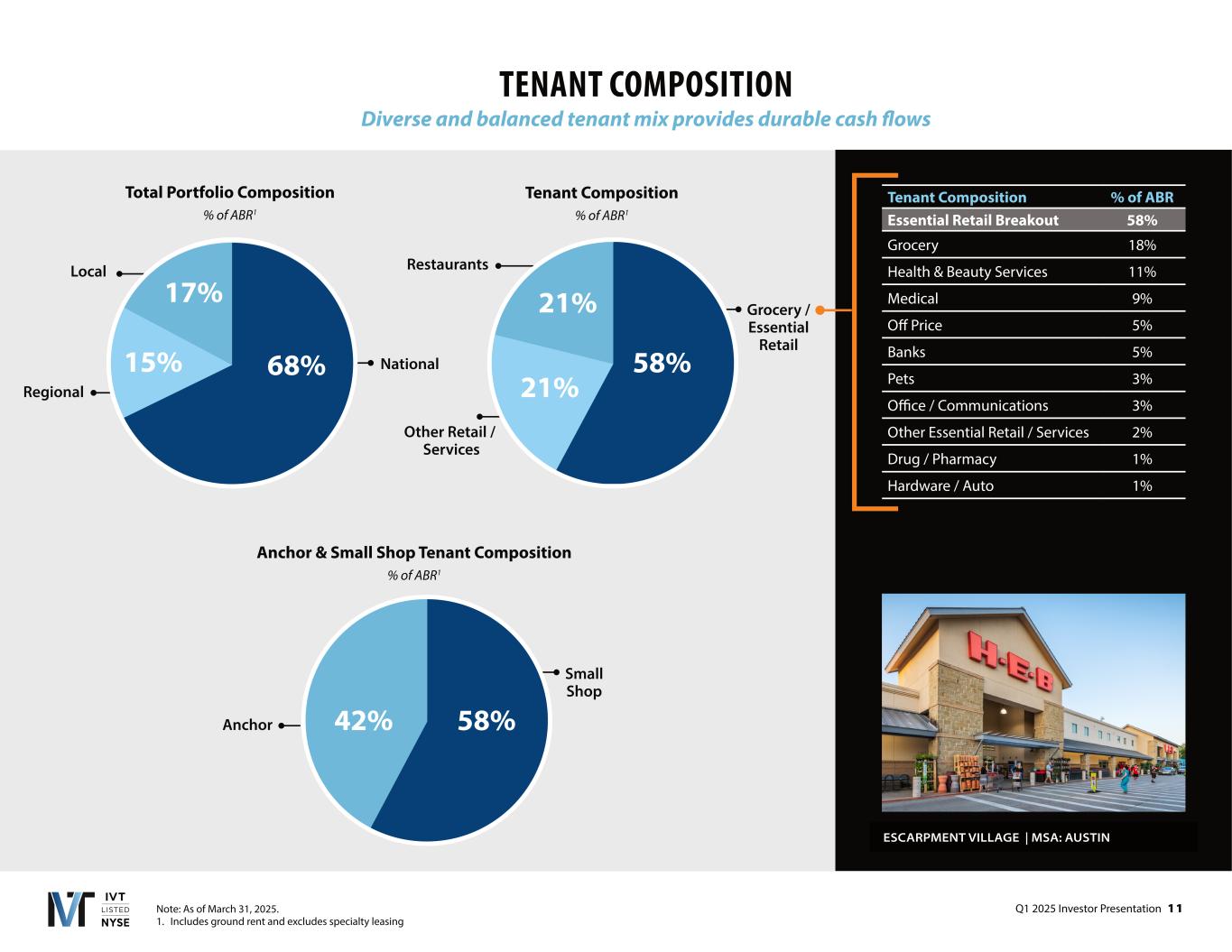 Q1 2025 Investor Presentation 1 1 Anchor Small Shop TENANT COMPOSITION Diverse and balanced tenant mix provides durable cash flows Other Retail / Services Restaurants Grocery / Essential Retail Total Portfolio Composition % of ABR1 Local Regional National Tenant Composition % of ABR Essential Retail Breakout 58% Grocery 18% Health & Beauty Services 11% Medical 9% Off Price 5% Banks 5% Pets 3% Office / Communications 3% Other Essential Retail / Services 2% Drug / Pharmacy 1% Hardware / Auto 1% ESCARPMENT VILLAGE | MSA: AUSTIN Tenant Composition % of ABR1 Anchor & Small Shop Tenant Composition % of ABR1 42% 58% Note: As of March 31, 2025. 1. Includes ground rent and excludes specialty leasing 21% 21% 58% 17% 15% 68%