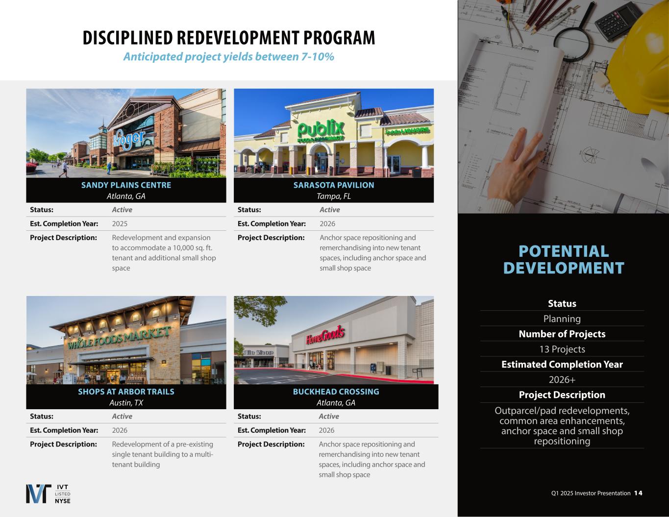 Q1 2025 Investor Presentation 1 4 SARASOTA PAVILION Tampa, FL Status: Active Est. Completion Year: 2026 Project Description: Anchor space repositioning and remerchandising into new tenant spaces, including anchor space and small shop space DISCIPLINED REDEVELOPMENT PROGRAM Anticipated project yields between 7-10% SHOPS AT ARBOR TRAILS Austin, TX Status: Active Est. Completion Year: 2026 Project Description: Redevelopment of a pre-existing single tenant building to a multi- tenant building BUCKHEAD CROSSING Atlanta, GA Status: Active Est. Completion Year: 2026 Project Description: Anchor space repositioning and remerchandising into new tenant spaces, including anchor space and small shop space SANDY PLAINS CENTRE Atlanta, GA Status: Active Est. Completion Year: 2025 Project Description: Redevelopment and expansion to accommodate a 10,000 sq. ft. tenant and additional small shop space POTENTIAL DEVELOPMENT Status Planning Number of Projects 13 Projects Estimated Completion Year 2026+ Project Description Outparcel/pad redevelopments, common area enhancements, anchor space and small shop repositioning
