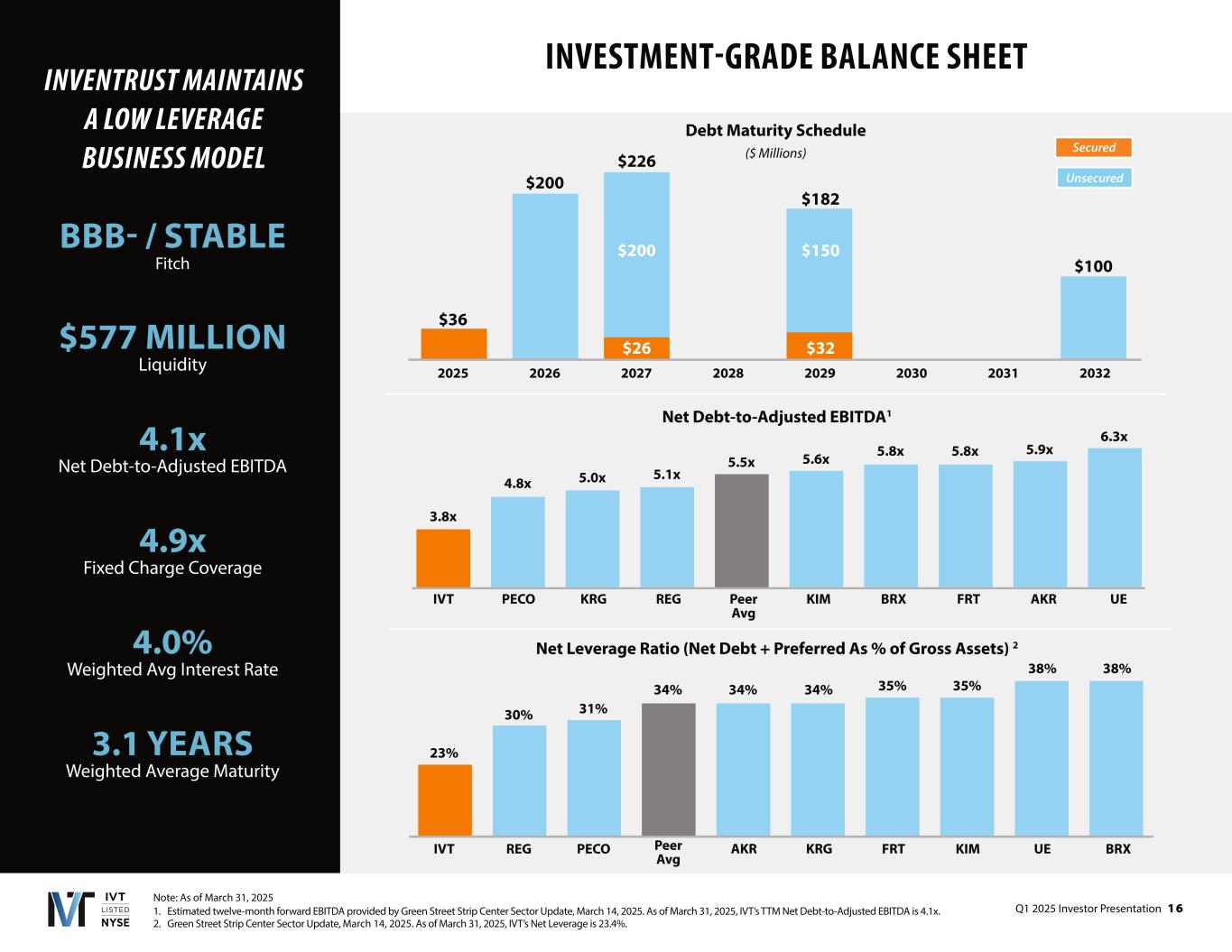 Q1 2025 Investor Presentation 1 6 IVT Peer Avg BRXREGPECO KIMKRG AKRFRT UE INVESTMENT-GRADE BALANCE SHEET 1. Estimated twelve-month forward EBITDA provided by Green Street Strip Center Sector Update, March 14, 2025. As of March 31, 2025, IVT’s TTM Net Debt-to-Adjusted EBITDA is 4.1x. 2. Green Street Strip Center Sector Update, March 14, 2025. As of March 31, 2025, IVT’s Net Leverage is 23.4%. BBB- / STABLE Fitch $577 MILLION Liquidity 4.1x Net Debt-to-Adjusted EBITDA 4.9x Fixed Charge Coverage 4.0% Weighted Avg Interest Rate 3.1 YEARS Weighted Average Maturity 2028 2030 2031 Secured Unsecured 2025 $36 2026 $200 2027 $226 $200 $26 2029 $182 $150 $32 2032 $100 Note: As of March 31, 2025 Net Leverage Ratio (Net Debt + Preferred As % of Gross Assets) 2 31%30% 23% Net Debt-to-Adjusted EBITDA1 3.8x 4.8x 5.0x 5.1x 5.5x INVENTRUST MAINTAINS A LOW LEVERAGE BUSINESS MODEL Debt Maturity Schedule ($ Millions) 5.8x 5.8x 5.9x 6.3x IVT REG PECO 34% KRG 34% AKR 35% FRT 35% KIM 38% BRX 38% UEPeer Avg 34% 5.6x
