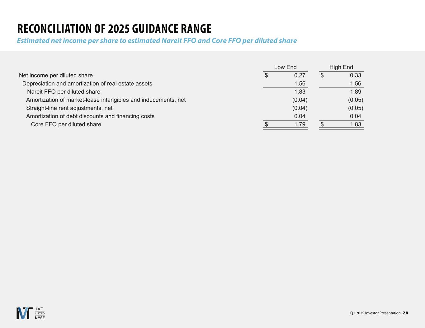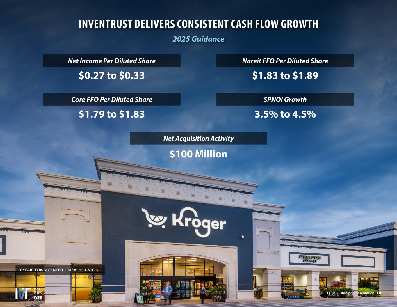 Q1 2025 Investor Presentation 2 8 RECONCILIATION OF 2025 GUIDANCE RANGE Estimated net income per share to estimated Nareit FFO and Core FFO per diluted share 2025 GUIDANCE InvenTrust has reaffirmed its 2025 guidance, as summarized in the following table. (Unaudited, dollars in thousands, except per share amounts) Current and Previous (1) (2) Net Income per diluted share $0.27 — $0.33 Nareit FFO per diluted share $1.83 — $1.89 Core FFO per diluted share (3) $1.79 — $1.83 Same Property NOI (“SPNOI”) Growth 3.50% — 4.50% General and administrative $34,250 — $35,750 Interest expense, net (4) $31,000 — $31,500 Net investment activity (5) ~ $100,000 (1) The Company’s 2025 guidance excludes projections related to gains or losses on dispositions, gains or losses on debt transactions, and depreciation, amortization, and straight-line rent adjustments related to acquisitions and dispositions. (2) The Company’s 2025 guidance includes an expectation of uncollectibility, reflected as 75-100 basis points of expected total revenue. (3) Core FFO per diluted share excludes amortization of market-lease intangibles and inducements, debt extinguishment charges, straight-line rent adjustments, depreciation and amortization of corporate assets, and non-operating income and expense. (4) Interest expense, net, excludes amortization of debt discounts and financing costs, and expected interest income of approximately $2.4 million. (5) Net investment activity represents anticipated acquisition activity less disposition activity. In addition to the foregoing assumptions, the Company's 2025 guidance incorporates a number of other assumptions that are subject to change and may be outside the control of the Company. If actual results vary from these assumptions, the Company's expectations may change. There can be no assurances that InvenTrust will achieve these results. The following table provides a reconciliation of the range of the Company's 2025 estimated net income per diluted share to estimated Nareit FFO and Core FFO per diluted share: (Unaudited) Low End High End Net income per diluted share $ 0.27 $ 0.33 Depreciation and amortization of real estate assets 1.56 1.56 Nareit FFO per diluted share 1.83 1.89 Amortization of market-lease intangibles and inducements, net (0.04) (0.05) Straight-line rent adjustments, net (0.04) (0.05) Amortization of debt discounts and financing costs 0.04 0.04 Core FFO per diluted share $ 1.79 $ 1.83 This earnings release does not include a reconciliation of forward-looking SPNOI to forward-looking GAAP Net Income because the Company is unable, without making unreasonable efforts, to provide a meaningful or reasonably accurate calculation or estimation of certain reconciling items which could be significant to the Company’s results. v Supplemental - Quarter Ended March 31, 2025
