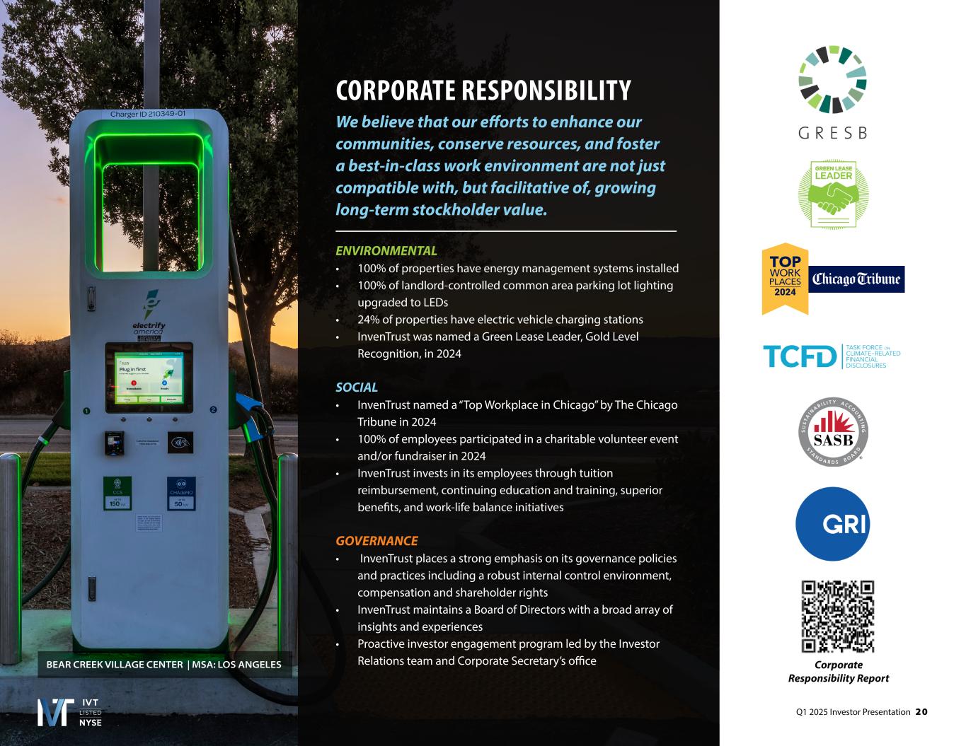 Q1 2025 Investor Presentation 2 0 CORPORATE RESPONSIBILITY We believe that our efforts to enhance our communities, conserve resources, and foster a best-in-class work environment are not just compatible with, but facilitative of, growing long-term stockholder value. ENVIRONMENTAL • 100% of properties have energy management systems installed • 100% of landlord-controlled common area parking lot lighting upgraded to LEDs • 24% of properties have electric vehicle charging stations • InvenTrust was named a Green Lease Leader, Gold Level Recognition, in 2024 SOCIAL • InvenTrust named a “Top Workplace in Chicago” by The Chicago Tribune in 2024 • 100% of employees participated in a charitable volunteer event and/or fundraiser in 2024 • InvenTrust invests in its employees through tuition reimbursement, continuing education and training, superior benefits, and work-life balance initiatives GOVERNANCE • InvenTrust places a strong emphasis on its governance policies and practices including a robust internal control environment, compensation and shareholder rights • InvenTrust maintains a Board of Directors with a broad array of insights and experiences • Proactive investor engagement program led by the Investor Relations team and Corporate Secretary’s office Corporate Responsibility Report BEAR CREEK VILLAGE CENTER | MSA: LOS ANGELES