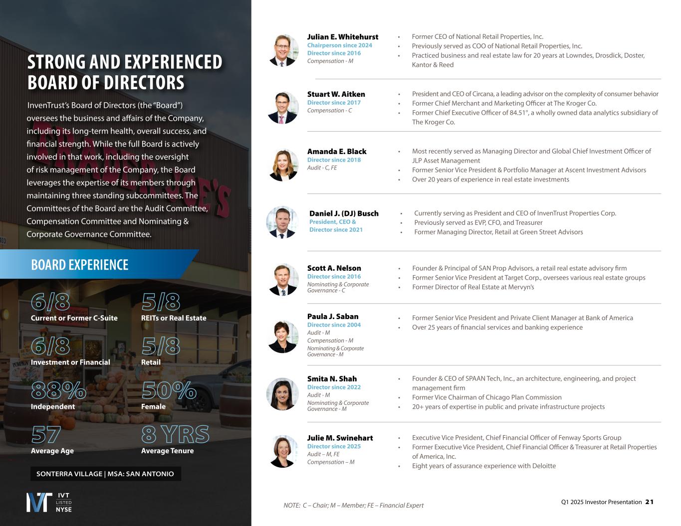 Q1 2025 Investor Presentation 2 1 Amanda E. Black Director since 2018 Audit - C, FE • Most recently served as Managing Director and Global Chief Investment Officer of JLP Asset Management • Former Senior Vice President & Portfolio Manager at Ascent Investment Advisors • Over 20 years of experience in real estate investments Stuart W. Aitken Director since 2017 Compensation - C • President and CEO of Circana, a leading advisor on the complexity of consumer behavior • Former Chief Merchant and Marketing Officer at The Kroger Co. • Former Chief Executive Officer of 84.51°, a wholly owned data analytics subsidiary of The Kroger Co. Paula J. Saban Director since 2004 Audit - M Compensation - M Nominating & Corporate Governance - M • Former Senior Vice President and Private Client Manager at Bank of America • Over 25 years of financial services and banking experience Scott A. Nelson Director since 2016 Nominating & Corporate Governance - C • Founder & Principal of SAN Prop Advisors, a retail real estate advisory firm • Former Senior Vice President at Target Corp., oversees various real estate groups • Former Director of Real Estate at Mervyn’s Daniel J. (DJ) Busch President, CEO & Director since 2021 • Currently serving as President and CEO of InvenTrust Properties Corp. • Previously served as EVP, CFO, and Treasurer • Former Managing Director, Retail at Green Street Advisors Julian E. Whitehurst Chairperson since 2024 Director since 2016 Compensation - M • Former CEO of National Retail Properties, Inc. • Previously served as COO of National Retail Properties, Inc. • Practiced business and real estate law for 20 years at Lowndes, Drosdick, Doster, Kantor & Reed Smita N. Shah Director since 2022 Audit - M Nominating & Corporate Governance - M • Founder & CEO of SPAAN Tech, Inc., an architecture, engineering, and project management firm • Former Vice Chairman of Chicago Plan Commission • 20+ years of expertise in public and private infrastructure projects Julie M. Swinehart Director since 2025 Audit – M, FE Compensation – M • Executive Vice President, Chief Financial Officer of Fenway Sports Group • Former Executive Vice President, Chief Financial Officer & Treasurer at Retail Properties of America, Inc. • Eight years of assurance experience with Deloitte NOTE: C – Chair; M – Member; FE – Financial Expert InvenTrust’s Board of Directors (the “Board”) oversees the business and affairs of the Company, including its long-term health, overall success, and financial strength. While the full Board is actively involved in that work, including the oversight of risk management of the Company, the Board leverages the expertise of its members through maintaining three standing subcommittees. The Committees of the Board are the Audit Committee, Compensation Committee and Nominating & Corporate Governance Committee. BOARD EXPERIENCE 6/8 Current or Former C-Suite 88% Independent 6/8 Investment or Financial 57 Average Age 5/8 Retail 5/8 REITs or Real Estate 50% Female 8 YRS Average Tenure STRONG AND EXPERIENCED BOARD OF DIRECTORS SONTERRA VILLAGE | MSA: SAN ANTONIO