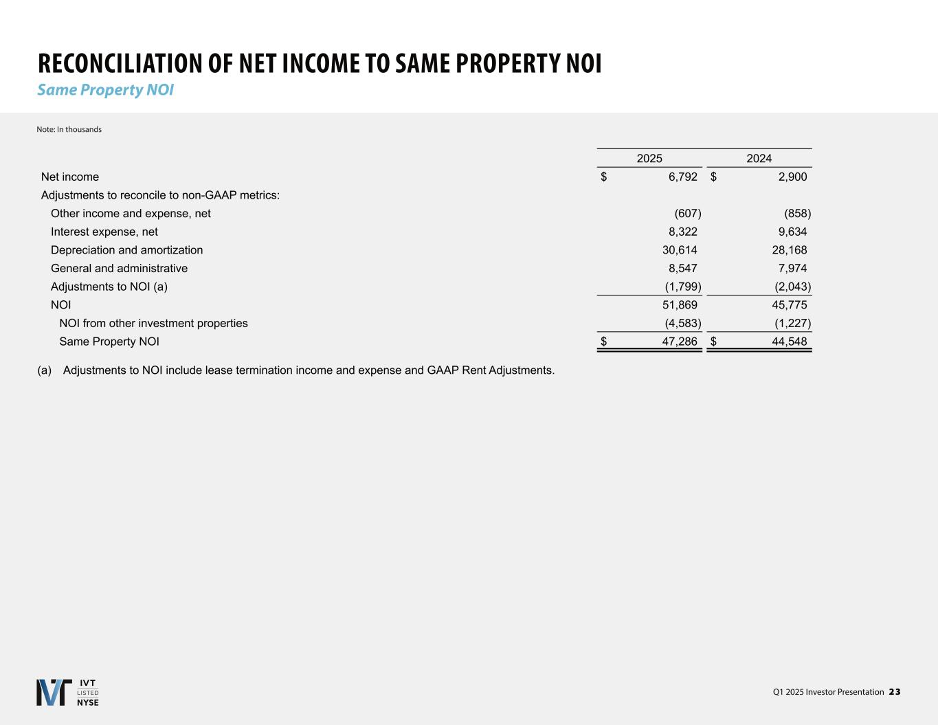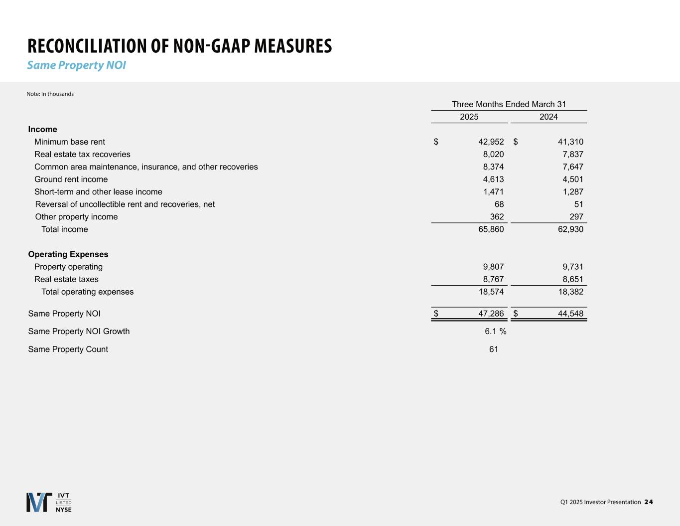 Q1 2025 Investor Presentation 2 3 RECONCILIATION OF NET INCOME TO SAME PROPERTY NOI Same Property NOI Note: In thousands Same Property NOI Income Minimum base rent $ 42,952 $ 41,310 Real estate tax recoveries 8,020 7,837 Common area maintenance, insurance, and other recoveries 8,374 7,647 Ground rent income 4,613 4,501 Short-term and other lease income 1,471 1,287 Reversal of uncollectible rent and recoveries, net 68 51 Other property income 362 297 Total income 65,860 62,930 Operating Expenses Property operating 9,807 9,731 Real estate taxes 8,767 8,651 Total operating expenses 18,574 18,382 Same Property NOI $ 47,286 $ 44,548 Three Months Ended March 31 2025 2024 Same Property NOI Growth 6.1 % Same Property Count 61 Net Income to Same Property NOI Three Months Ended March 31 2025 2024 Net income $ 6,792 $ 2,900 Adjustments to reconcile to non-GAAP metrics: Other income and expense, net (607) (858) Interest expense, net 8,322 9,634 Depreciation and amortization 30,614 28,168 General and administrative 8,547 7,974 Adjustments to NOI (a) (1,799) (2,043) NOI 51,869 45,775 NOI from other investment properties (4,583) (1,227) Same Property NOI $ 47,286 $ 44,548 (a) Adjustments to NOI include lease termination income and expense and GAAP Rent Adjustments. Reconciliation of Non-GAAP Measures In thousands 6 Supplemental - Quarter Ended March 31, 2025