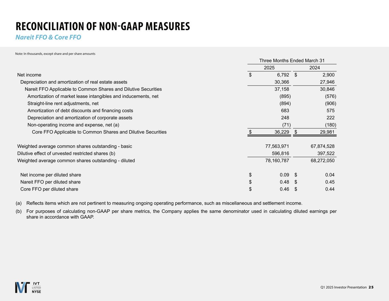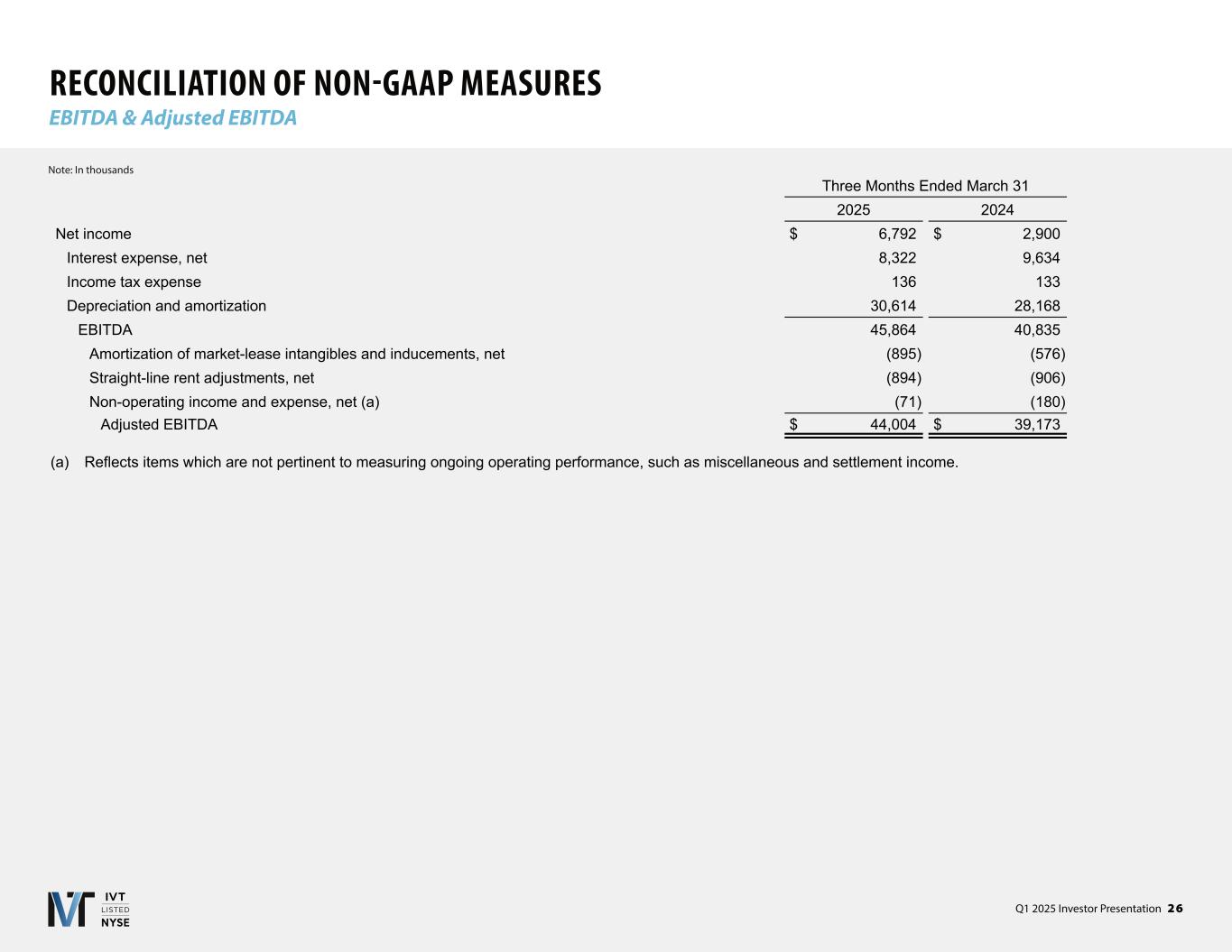 Q1 2025 Investor Presentation 2 6 RECONCILIATION OF NON-GAAP MEASURES EBITDA & Adjusted EBITDA Note: In thousands Nareit FFO and Core FFO Three Months Ended March 31 2025 2024 Net income $ 6,792 $ 2,900 Depreciation and amortization of real estate assets 30,366 27,946 Nareit FFO Applicable to Common Shares and Dilutive Securities 37,158 30,846 Amortization of market lease intangibles and inducements, net (895) (576) Straight-line rent adjustments, net (894) (906) Amortization of debt discounts and financing costs 683 575 Depreciation and amortization of corporate assets 248 222 Non-operating income and expense, net (a) (71) (180) Core FFO Applicable to Common Shares and Dilutive Securities $ 36,229 $ 29,981 Weighted average common shares outstanding - basic 77,563,971 67,874,528 Dilutive effect of unvested restricted shares (b) 596,816 397,522 Weighted average common shares outstanding - diluted 78,160,787 68,272,050 Net income per diluted share $ 0.09 $ 0.04 Nareit FFO per diluted share $ 0.48 $ 0.45 Core FFO per diluted share $ 0.46 $ 0.44 (a) Reflects items which are not pertinent to measuring ongoing operating performance, such as miscellaneous and settlement income. (b) For purposes of calculating non-GAAP per share metrics, the Company applies the same denominator used in calculating diluted earnings per share in accordance with GAAP. EBITDA and Adjusted EBITDA Net income $ 6,792 $ 2,900 Interest expense, net 8,322 9,634 Income tax expense 136 133 Depreciation and amortization 30,614 28,168 EBITDA 45,864 40,835 Amortization of market-lease intangibles and inducements, net (895) (576) Straight-line rent adjustments, net (894) (906) Non-operating income and expense, net (a) (71) (180) Adjusted EBITDA $ 44,004 $ 39,173 Three Months Ended March 31 2025 2024 (a) Reflects items which are not pertinent to measuring ongoing operating performance, such as miscellaneous and settlement income. Reconciliation of Non-GAAP Measures, continued In thousands 7 Supplemental - Quarter Ended March 31, 2025