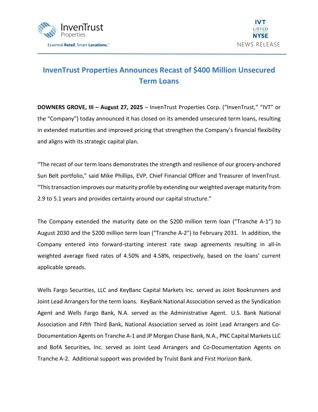 NEWS RELEASE InvenTrust Properties Announces Recast of $400 Million Unsecured Term Loans DOWNERS GROVE, III – August 27, 2025 – InvenTrust Properties Corp. (“InvenTrust,” “IVT” or the “Company”) today announced it has closed on its amended unsecured term loans, resulting in extended maturities and improved pricing that strengthen the Company’s financial flexibility and aligns with its strategic capital plan. “The recast of our term loans demonstrates the strength and resilience of our grocery-anchored Sun Belt portfolio,” said Mike Phillips, EVP, Chief Financial Officer and Treasurer of InvenTrust. “This transaction improves our maturity profile by extending our weighted average maturity from 2.9 to 5.1 years and provides certainty around our capital structure.” The Company extended the maturity date on the $200 million term loan (“Tranche A-1”) to August 2030 and the $200 million term loan (“Tranche A-2”) to February 2031. In addition, the Company entered into forward-starting interest rate swap agreements resulting in all-in weighted average fixed rates of 4.50% and 4.58%, respectively, based on the loans’ current applicable spreads. Wells Fargo Securities, LLC and KeyBanc Capital Markets Inc. served as Joint Bookrunners and Joint Lead Arrangers for the term loans. KeyBank National Association served as the Syndication Agent and Wells Fargo Bank, N.A. served as the Administrative Agent. U.S. Bank National Association and Fifth Third Bank, National Association served as Joint Lead Arrangers and Co- Documentation Agents on Tranche A-1 and JP Morgan Chase Bank, N.A., PNC Capital Markets LLC and BofA Securities, Inc. served as Joint Lead Arrangers and Co-Documentation Agents on Tranche A-2. Additional support was provided by Truist Bank and First Horizon Bank.