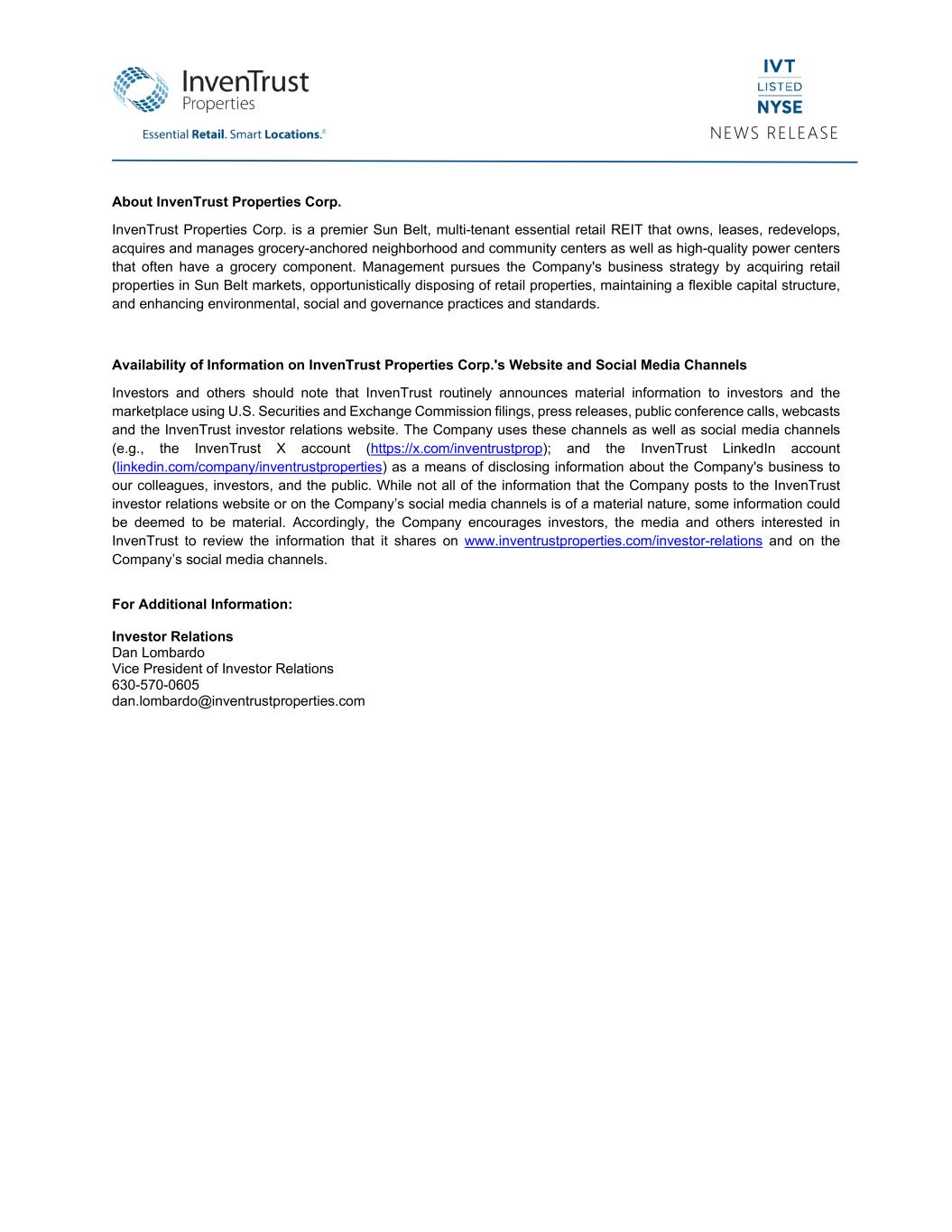 NEWS RELEASE About InvenTrust Properties Corp. InvenTrust Properties Corp. is a premier Sun Belt, multi-tenant essential retail REIT that owns, leases, redevelops, acquires and manages grocery-anchored neighborhood and community centers as well as high-quality power centers that often have a grocery component. Management pursues the Company's business strategy by acquiring retail properties in Sun Belt markets, opportunistically disposing of retail properties, maintaining a flexible capital structure, and enhancing environmental, social and governance practices and standards. Availability of Information on InvenTrust Properties Corp.'s Website and Social Media Channels Investors and others should note that InvenTrust routinely announces material information to investors and the marketplace using U.S. Securities and Exchange Commission filings, press releases, public conference calls, webcasts and the InvenTrust investor relations website. The Company uses these channels as well as social media channels (e.g., the InvenTrust X account (https://x.com/inventrustprop); and the InvenTrust LinkedIn account (linkedin.com/company/inventrustproperties) as a means of disclosing information about the Company's business to our colleagues, investors, and the public. While not all of the information that the Company posts to the InvenTrust investor relations website or on the Company’s social media channels is of a material nature, some information could be deemed to be material. Accordingly, the Company encourages investors, the media and others interested in InvenTrust to review the information that it shares on www.inventrustproperties.com/investor-relations and on the Company’s social media channels. For Additional Information: Investor Relations Dan Lombardo Vice President of Investor Relations 630-570-0605 dan.lombardo@inventrustproperties.com