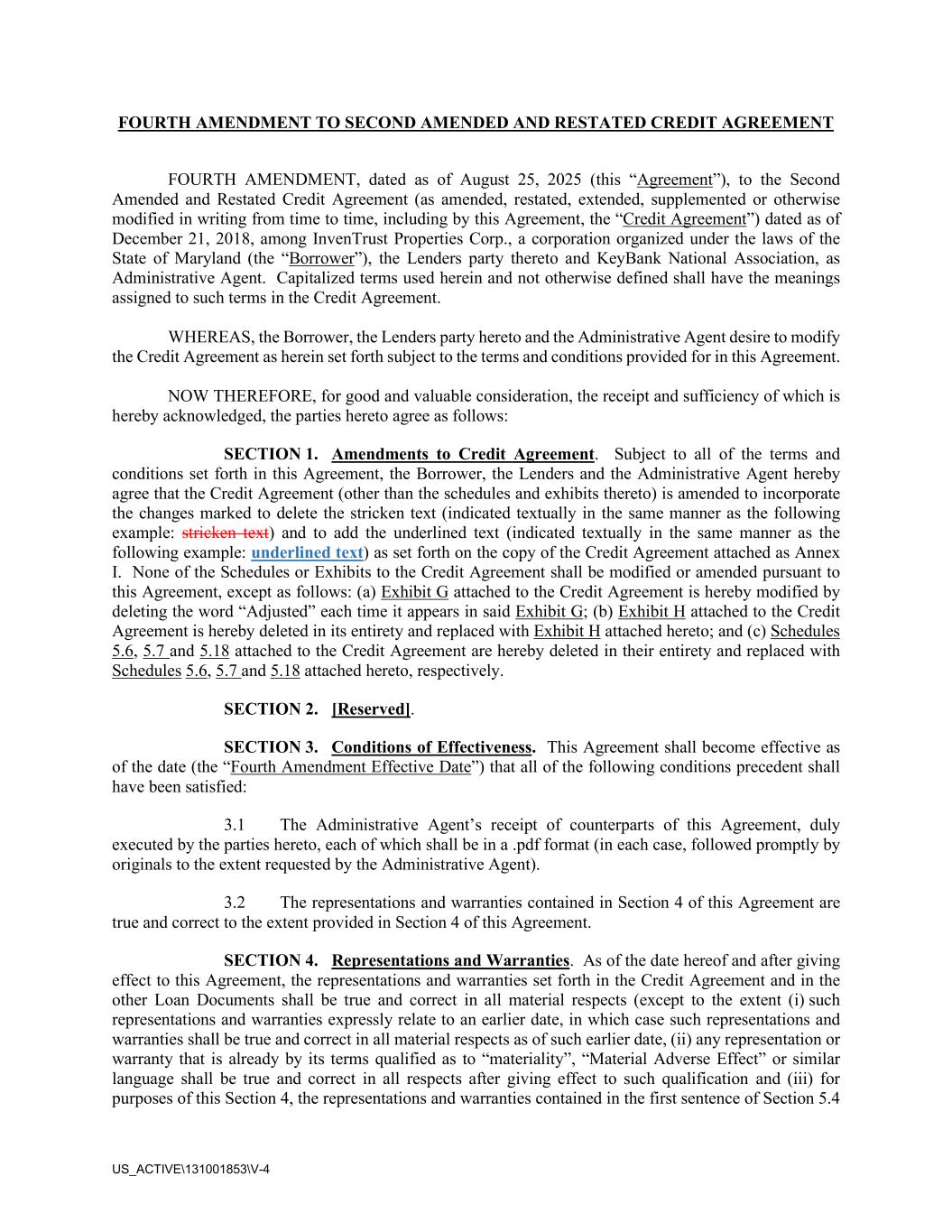 US_ACTIVE\131001853\V-4 FOURTH AMENDMENT TO SECOND AMENDED AND RESTATED CREDIT AGREEMENT FOURTH AMENDMENT, dated as of August 25, 2025 (this “Agreement”), to the Second Amended and Restated Credit Agreement (as amended, restated, extended, supplemented or otherwise modified in writing from time to time, including by this Agreement, the “Credit Agreement”) dated as of December 21, 2018, among InvenTrust Properties Corp., a corporation organized under the laws of the State of Maryland (the “Borrower”), the Lenders party thereto and KeyBank National Association, as Administrative Agent. Capitalized terms used herein and not otherwise defined shall have the meanings assigned to such terms in the Credit Agreement. WHEREAS, the Borrower, the Lenders party hereto and the Administrative Agent desire to modify the Credit Agreement as herein set forth subject to the terms and conditions provided for in this Agreement. NOW THEREFORE, for good and valuable consideration, the receipt and sufficiency of which is hereby acknowledged, the parties hereto agree as follows: SECTION 1. Amendments to Credit Agreement. Subject to all of the terms and conditions set forth in this Agreement, the Borrower, the Lenders and the Administrative Agent hereby agree that the Credit Agreement (other than the schedules and exhibits thereto) is amended to incorporate the changes marked to delete the stricken text (indicated textually in the same manner as the following example: stricken text) and to add the underlined text (indicated textually in the same manner as the following example: underlined text) as set forth on the copy of the Credit Agreement attached as Annex I. None of the Schedules or Exhibits to the Credit Agreement shall be modified or amended pursuant to this Agreement, except as follows: (a) Exhibit G attached to the Credit Agreement is hereby modified by deleting the word “Adjusted” each time it appears in said Exhibit G; (b) Exhibit H attached to the Credit Agreement is hereby deleted in its entirety and replaced with Exhibit H attached hereto; and (c) Schedules 5.6, 5.7 and 5.18 attached to the Credit Agreement are hereby deleted in their entirety and replaced with Schedules 5.6, 5.7 and 5.18 attached hereto, respectively. SECTION 2. [Reserved]. SECTION 3. Conditions of Effectiveness. This Agreement shall become effective as of the date (the “Fourth Amendment Effective Date”) that all of the following conditions precedent shall have been satisfied: 3.1 The Administrative Agent’s receipt of counterparts of this Agreement, duly executed by the parties hereto, each of which shall be in a .pdf format (in each case, followed promptly by originals to the extent requested by the Administrative Agent). 3.2 The representations and warranties contained in Section 4 of this Agreement are true and correct to the extent provided in Section 4 of this Agreement. SECTION 4. Representations and Warranties. As of the date hereof and after giving effect to this Agreement, the representations and warranties set forth in the Credit Agreement and in the other Loan Documents shall be true and correct in all material respects (except to the extent (i) such representations and warranties expressly relate to an earlier date, in which case such representations and warranties shall be true and correct in all material respects as of such earlier date, (ii) any representation or warranty that is already by its terms qualified as to “materiality”, “Material Adverse Effect” or similar language shall be true and correct in all respects after giving effect to such qualification and (iii) for purposes of this Section 4, the representations and warranties contained in the first sentence of Section 5.4