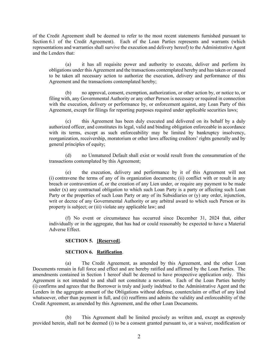 2 of the Credit Agreement shall be deemed to refer to the most recent statements furnished pursuant to Section 6.1 of the Credit Agreement). Each of the Loan Parties represents and warrants (which representations and warranties shall survive the execution and delivery hereof) to the Administrative Agent and the Lenders that: (a) it has all requisite power and authority to execute, deliver and perform its obligations under this Agreement and the transactions contemplated hereby and has taken or caused to be taken all necessary action to authorize the execution, delivery and performance of this Agreement and the transactions contemplated hereby; (b) no approval, consent, exemption, authorization, or other action by, or notice to, or filing with, any Governmental Authority or any other Person is necessary or required in connection with the execution, delivery or performance by, or enforcement against, any Loan Party of this Agreement, except for filings for reporting purposes required under applicable securities laws; (c) this Agreement has been duly executed and delivered on its behalf by a duly authorized officer, and constitutes its legal, valid and binding obligation enforceable in accordance with its terms, except as such enforceability may be limited by bankruptcy insolvency, reorganization, receivership, moratorium or other laws affecting creditors’ rights generally and by general principles of equity; (d) no Unmatured Default shall exist or would result from the consummation of the transactions contemplated by this Agreement; (e) the execution, delivery and performance by it of this Agreement will not (i) contravene the terms of any of its organization documents; (ii) conflict with or result in any breach or contravention of, or the creation of any Lien under, or require any payment to be made under (x) any contractual obligation to which such Loan Party is a party or affecting such Loan Party or the properties of such Loan Party or any of its Subsidiaries or (y) any order, injunction, writ or decree of any Governmental Authority or any arbitral award to which such Person or its property is subject; or (iii) violate any applicable law; and (f) No event or circumstance has occurred since December 31, 2024 that, either individually or in the aggregate, that has had or could reasonably be expected to have a Material Adverse Effect. SECTION 5. [Reserved]. SECTION 6. Ratification. (a) The Credit Agreement, as amended by this Agreement, and the other Loan Documents remain in full force and effect and are hereby ratified and affirmed by the Loan Parties. The amendments contained in Section 1 hereof shall be deemed to have prospective application only. This Agreement is not intended to and shall not constitute a novation. Each of the Loan Parties hereby (i) confirms and agrees that the Borrower is truly and justly indebted to the Administrative Agent and the Lenders in the aggregate amount of the Obligations without defense, counterclaim or offset of any kind whatsoever, other than payment in full, and (ii) reaffirms and admits the validity and enforceability of the Credit Agreement, as amended by this Agreement, and the other Loan Documents. (b) This Agreement shall be limited precisely as written and, except as expressly provided herein, shall not be deemed (i) to be a consent granted pursuant to, or a waiver, modification or