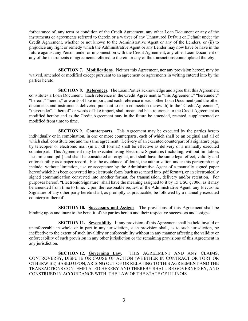 3 forbearance of, any term or condition of the Credit Agreement, any other Loan Document or any of the instruments or agreements referred to therein or a waiver of any Unmatured Default or Default under the Credit Agreement, whether or not known to the Administrative Agent or any of the Lenders, or (ii) to prejudice any right or remedy which the Administrative Agent or any Lender may now have or have in the future against any Person under or in connection with the Credit Agreement, any other Loan Document or any of the instruments or agreements referred to therein or any of the transactions contemplated thereby. SECTION 7. Modifications. Neither this Agreement, nor any provision hereof, may be waived, amended or modified except pursuant to an agreement or agreements in writing entered into by the parties hereto. SECTION 8. References. The Loan Parties acknowledge and agree that this Agreement constitutes a Loan Document. Each reference in the Credit Agreement to “this Agreement,” “hereunder,” “hereof,” “herein,” or words of like import, and each reference in each other Loan Document (and the other documents and instruments delivered pursuant to or in connection therewith) to the “Credit Agreement”, “thereunder”, “thereof” or words of like import, shall mean and be a reference to the Credit Agreement as modified hereby and as the Credit Agreement may in the future be amended, restated, supplemented or modified from time to time. SECTION 9. Counterparts. This Agreement may be executed by the parties hereto individually or in combination, in one or more counterparts, each of which shall be an original and all of which shall constitute one and the same agreement. Delivery of an executed counterpart of a signature page by telecopier or electronic mail (in a .pdf format) shall be effective as delivery of a manually executed counterpart. This Agreement may be executed using Electronic Signatures (including, without limitation, facsimile and .pdf) and shall be considered an original, and shall have the same legal effect, validity and enforceability as a paper record. For the avoidance of doubt, the authorization under this paragraph may include, without limitation, use or acceptance by the Administrative Agent of a manually signed paper hereof which has been converted into electronic form (such as scanned into .pdf format), or an electronically signed communication converted into another format, for transmission, delivery and/or retention. For purposes hereof, “Electronic Signature” shall have the meaning assigned to it by 15 USC §7006, as it may be amended from time to time. Upon the reasonable request of the Administrative Agent, any Electronic Signature of any other party hereto shall, as promptly as practicable, be followed by a manually executed counterpart thereof. SECTION 10. Successors and Assigns. The provisions of this Agreement shall be binding upon and inure to the benefit of the parties hereto and their respective successors and assigns. SECTION 11. Severability. If any provision of this Agreement shall be held invalid or unenforceable in whole or in part in any jurisdiction, such provision shall, as to such jurisdiction, be ineffective to the extent of such invalidity or enforceability without in any manner affecting the validity or enforceability of such provision in any other jurisdiction or the remaining provisions of this Agreement in any jurisdiction. SECTION 12. Governing Law. THIS AGREEMENT AND ANY CLAIMS, CONTROVERSY, DISPUTE OR CAUSE OF ACTION (WHETHER IN CONTRACT OR TORT OR OTHERWISE) BASED UPON, ARISING OUT OF OR RELATING TO THIS AGREEMENT AND THE TRANSACTIONS CONTEMPLATED HEREBY AND THEREBY SHALL BE GOVERNED BY, AND CONSTRUED IN ACCORDANCE WITH, THE LAW OF THE STATE OF ILLINOIS.