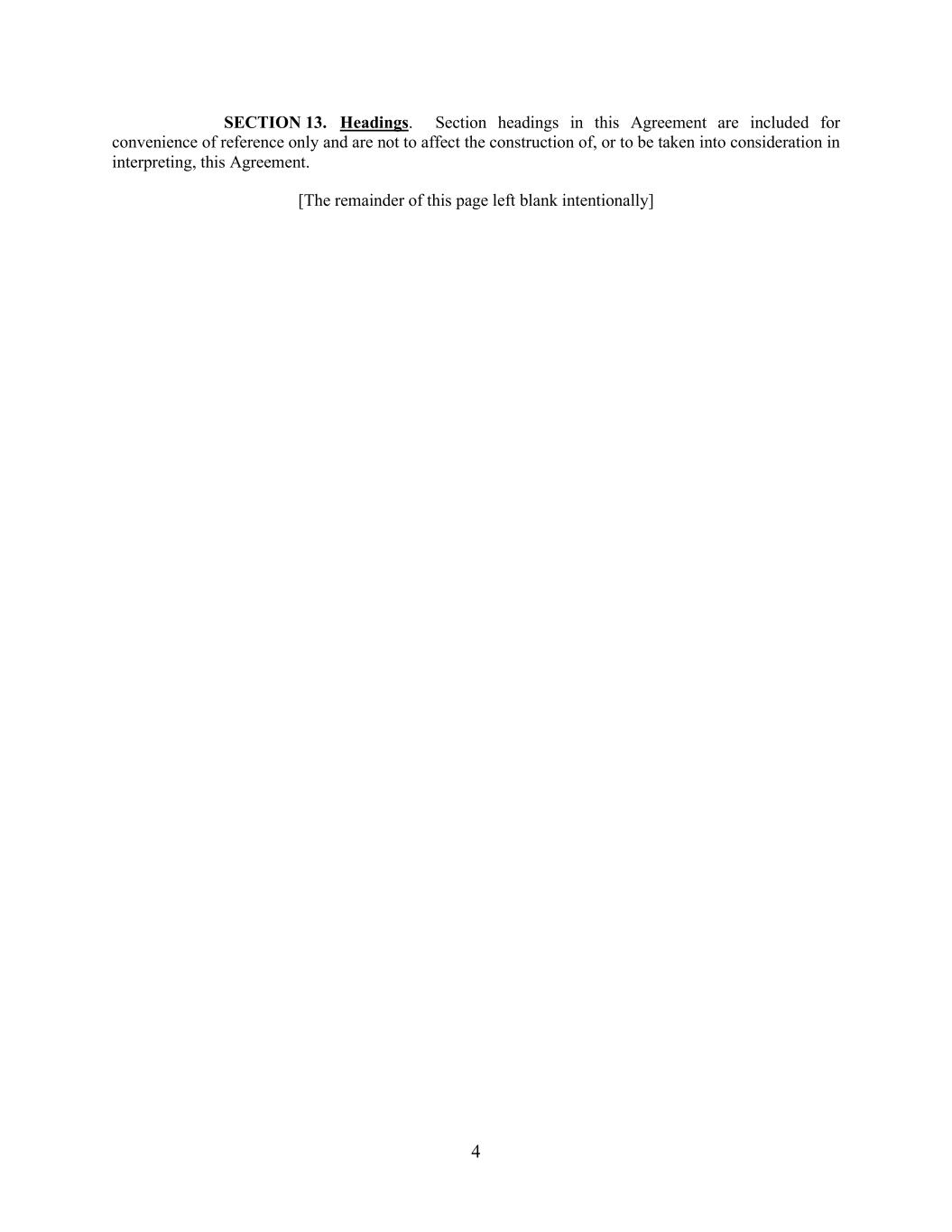 4 SECTION 13. Headings. Section headings in this Agreement are included for convenience of reference only and are not to affect the construction of, or to be taken into consideration in interpreting, this Agreement. [The remainder of this page left blank intentionally]