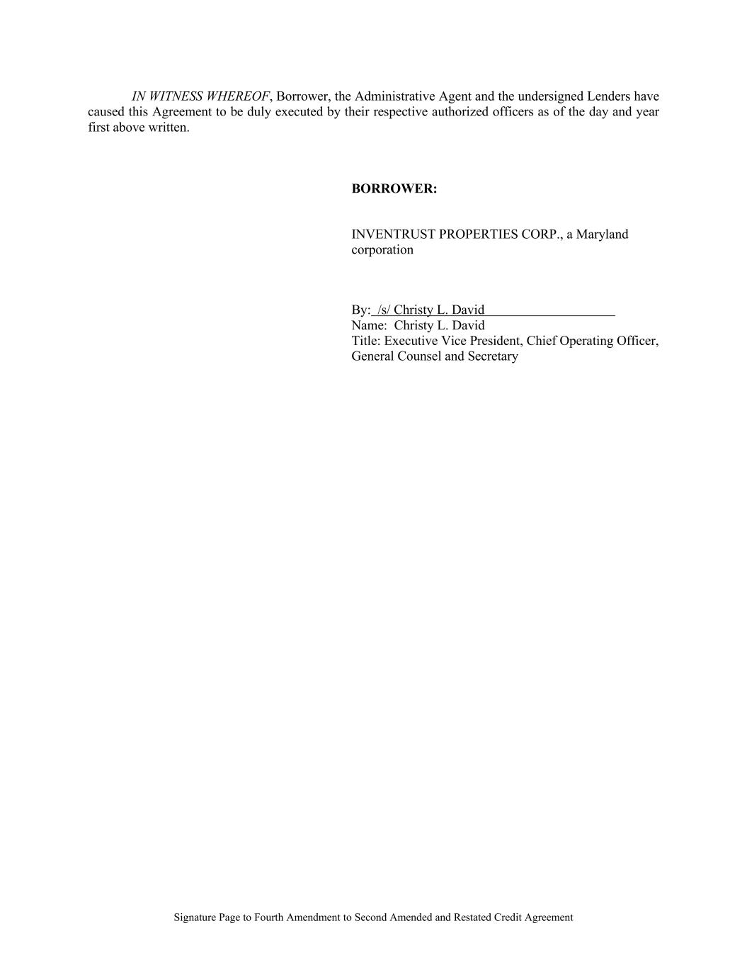 Signature Page to Fourth Amendment to Second Amended and Restated Credit Agreement IN WITNESS WHEREOF, Borrower, the Administrative Agent and the undersigned Lenders have caused this Agreement to be duly executed by their respective authorized officers as of the day and year first above written. BORROWER: INVENTRUST PROPERTIES CORP., a Maryland corporation By: /s/ Christy L. David Name: Christy L. David Title: Executive Vice President, Chief Operating Officer, General Counsel and Secretary