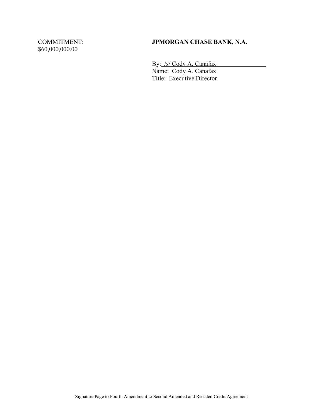 Signature Page to Fourth Amendment to Second Amended and Restated Credit Agreement COMMITMENT: JPMORGAN CHASE BANK, N.A. $60,000,000.00 By: /s/ Cody A. Canafax Name: Cody A. Canafax Title: Executive Director