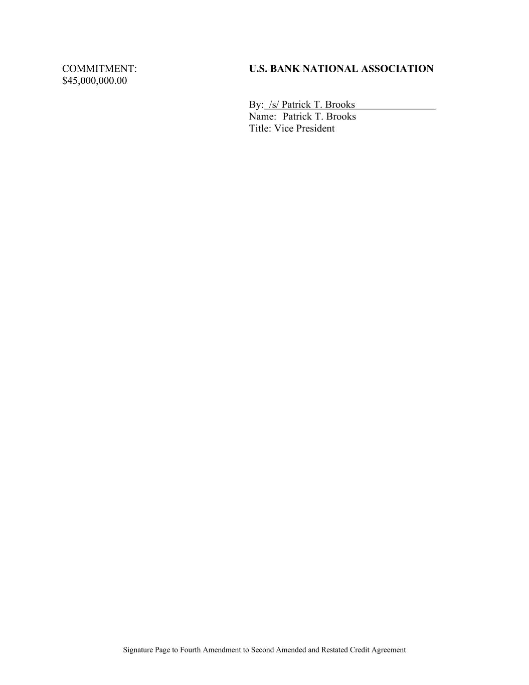 Signature Page to Fourth Amendment to Second Amended and Restated Credit Agreement COMMITMENT: U.S. BANK NATIONAL ASSOCIATION $45,000,000.00 By: /s/ Patrick T. Brooks Name: Patrick T. Brooks Title: Vice President