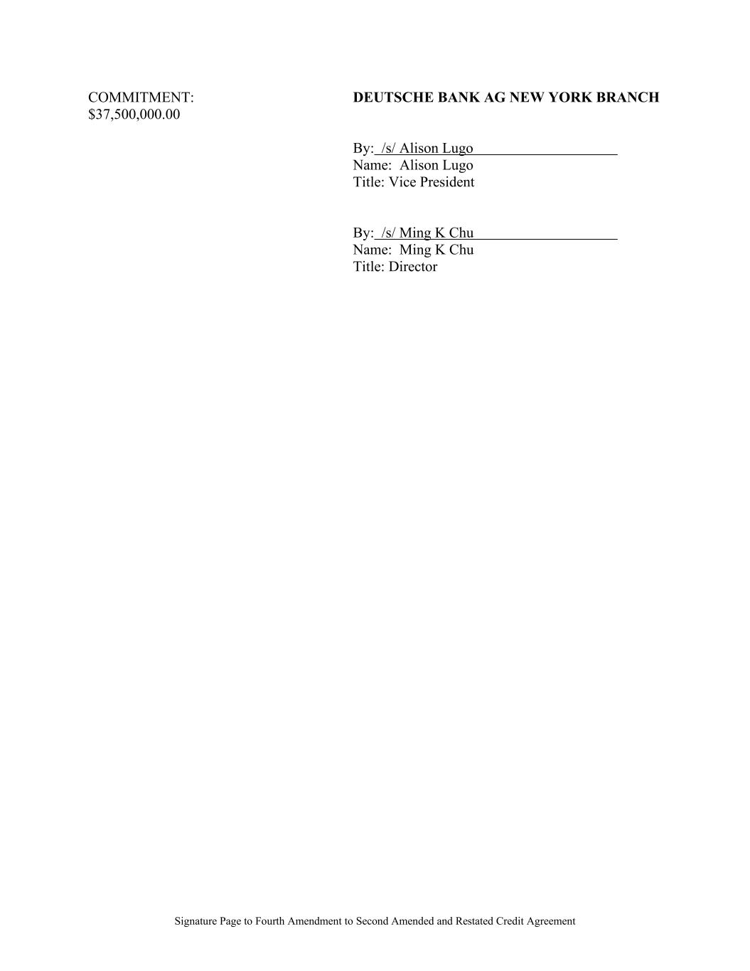 Signature Page to Fourth Amendment to Second Amended and Restated Credit Agreement COMMITMENT: DEUTSCHE BANK AG NEW YORK BRANCH $37,500,000.00 By: /s/ Alison Lugo Name: Alison Lugo Title: Vice President By: /s/ Ming K Chu Name: Ming K Chu Title: Director