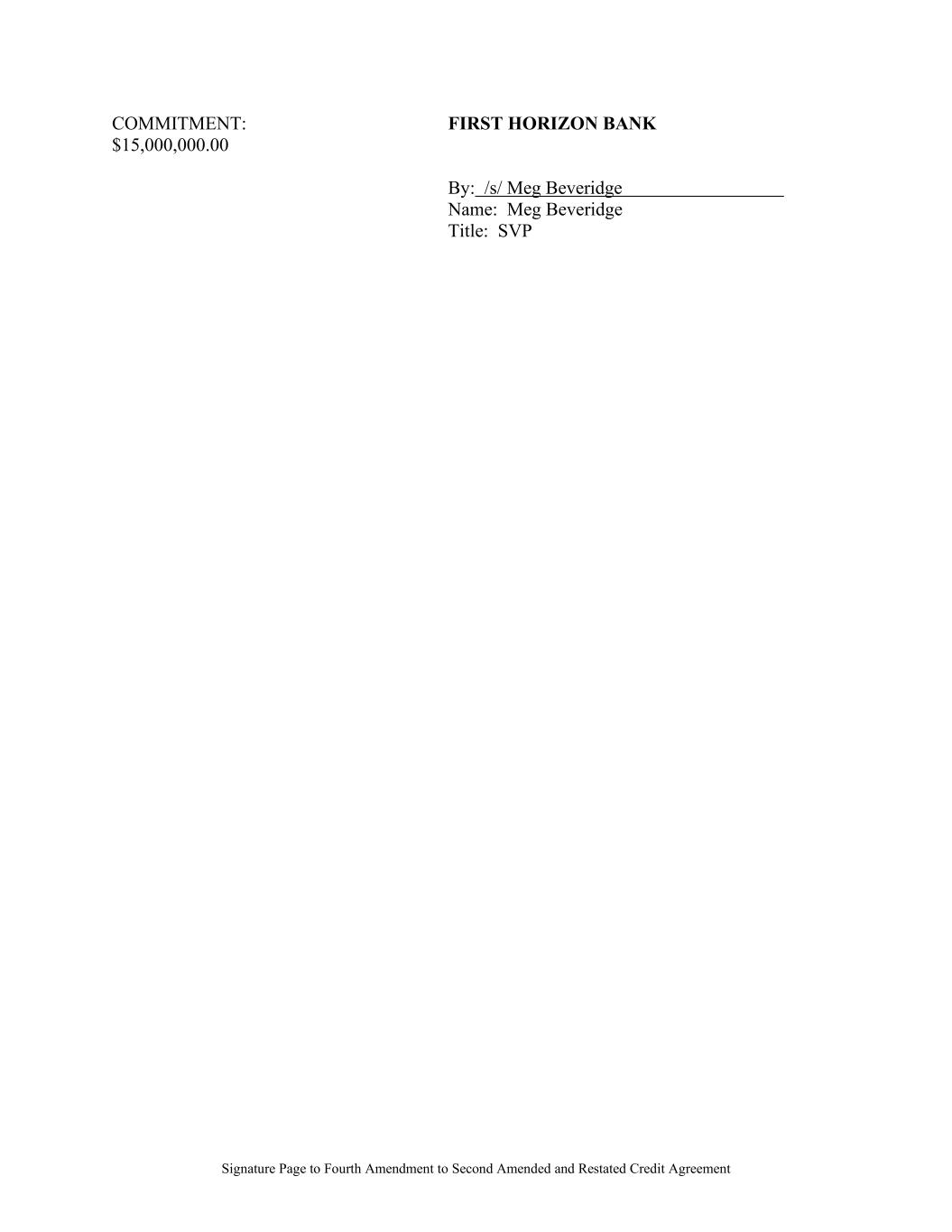 Signature Page to Fourth Amendment to Second Amended and Restated Credit Agreement COMMITMENT: FIRST HORIZON BANK $15,000,000.00 By: /s/ Meg Beveridge Name: Meg Beveridge Title: SVP