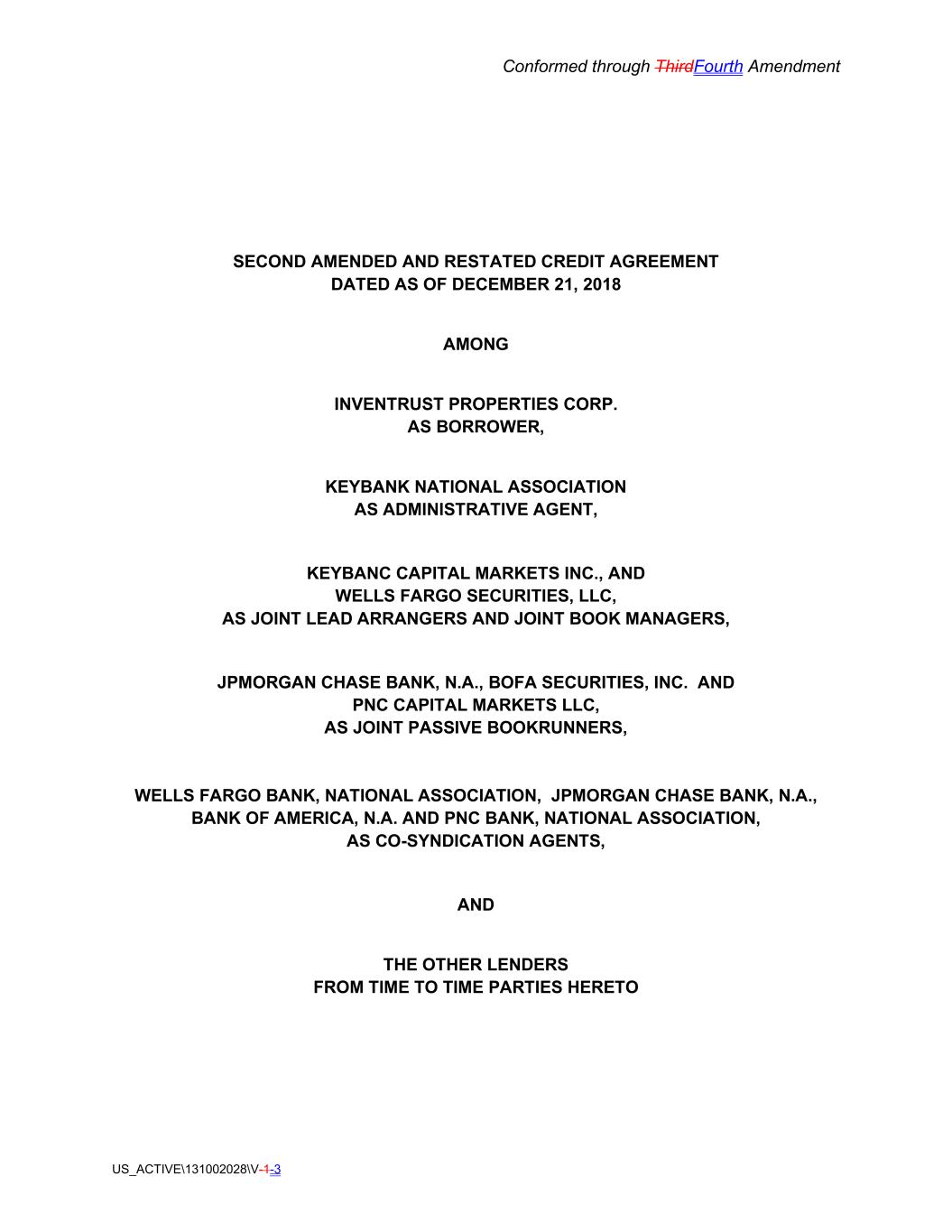 Conformed through ThirdFourth Amendment US_ACTIVE\131002028\V-1-3 SECOND AMENDED AND RESTATED CREDIT AGREEMENT DATED AS OF DECEMBER 21, 2018 AMONG INVENTRUST PROPERTIES CORP. AS BORROWER, KEYBANK NATIONAL ASSOCIATION AS ADMINISTRATIVE AGENT, KEYBANC CAPITAL MARKETS INC., AND WELLS FARGO SECURITIES, LLC, AS JOINT LEAD ARRANGERS AND JOINT BOOK MANAGERS, JPMORGAN CHASE BANK, N.A., BOFA SECURITIES, INC. AND PNC CAPITAL MARKETS LLC, AS JOINT PASSIVE BOOKRUNNERS, WELLS FARGO BANK, NATIONAL ASSOCIATION, JPMORGAN CHASE BANK, N.A., BANK OF AMERICA, N.A. AND PNC BANK, NATIONAL ASSOCIATION, AS CO-SYNDICATION AGENTS, AND THE OTHER LENDERS FROM TIME TO TIME PARTIES HERETO