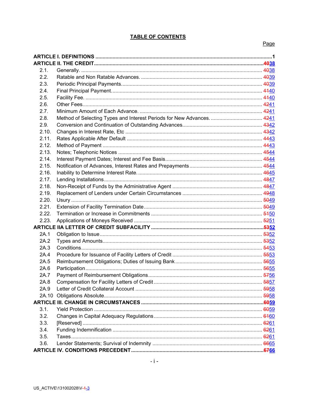 - i - US_ACTIVE\131002028\V-1-3 TABLE OF CONTENTS Page ARTICLE I. DEFINITIONS ............................................................................................................................ 1 ARTICLE II. THE CREDIT .......................................................................................................................4038 2.1. Generally. ............................................................................................................................... 4038 2.2. Ratable and Non Ratable Advances. ..................................................................................... 4039 2.3. Periodic Principal Payments. .................................................................................................. 4039 2.4. Final Principal Payment. ......................................................................................................... 4140 2.5. Facility Fee. ............................................................................................................................ 4140 2.6. Other Fees. ............................................................................................................................. 4241 2.7. Minimum Amount of Each Advance. ...................................................................................... 4241 2.8. Method of Selecting Types and Interest Periods for New Advances. .................................... 4241 2.9. Conversion and Continuation of Outstanding Advances........................................................ 4342 2.10. Changes in Interest Rate, Etc ................................................................................................ 4342 2.11. Rates Applicable After Default ............................................................................................... 4443 2.12. Method of Payment ................................................................................................................ 4443 2.13. Notes; Telephonic Notices ..................................................................................................... 4544 2.14. Interest Payment Dates; Interest and Fee Basis .................................................................... 4544 2.15. Notification of Advances, Interest Rates and Prepayments ................................................... 4544 2.16. Inability to Determine Interest Rate. ....................................................................................... 4645 2.17. Lending Installations ............................................................................................................... 4847 2.18. Non-Receipt of Funds by the Administrative Agent ............................................................... 4847 2.19. Replacement of Lenders under Certain Circumstances ........................................................ 4948 2.20. Usury ...................................................................................................................................... 5049 2.21. Extension of Facility Termination Date ................................................................................... 5049 2.22. Termination or Increase in Commitments .............................................................................. 5150 2.23. Applications of Moneys Received .......................................................................................... 5251 ARTICLE IIA LETTER OF CREDIT SUBFACILITY ...............................................................................5352 2A.1 Obligation to Issue .................................................................................................................. 5352 2A.2 Types and Amounts................................................................................................................ 5352 2A.3 Conditions ............................................................................................................................... 5453 2A.4 Procedure for Issuance of Facility Letters of Credit ............................................................... 5553 2A.5 Reimbursement Obligations; Duties of Issuing Bank ............................................................. 5655 2A.6 Participation ............................................................................................................................ 5655 2A.7 Payment of Reimbursement Obligations ................................................................................ 5756 2A.8 Compensation for Facility Letters of Credit ............................................................................ 5857 2A.9 Letter of Credit Collateral Account ......................................................................................... 5958 2A.10 Obligations Absolute............................................................................................................... 5958 ARTICLE III. CHANGE IN CIRCUMSTANCES ......................................................................................6059 3.1. Yield Protection ...................................................................................................................... 6059 3.2. Changes in Capital Adequacy Regulations ............................................................................ 6160 3.3. [Reserved] .............................................................................................................................. 6261 3.4. Funding Indemnification ......................................................................................................... 6261 3.5. Taxes ...................................................................................................................................... 6261 3.6. Lender Statements; Survival of Indemnity ............................................................................. 6665 ARTICLE IV. CONDITIONS PRECEDENT ...........................................................