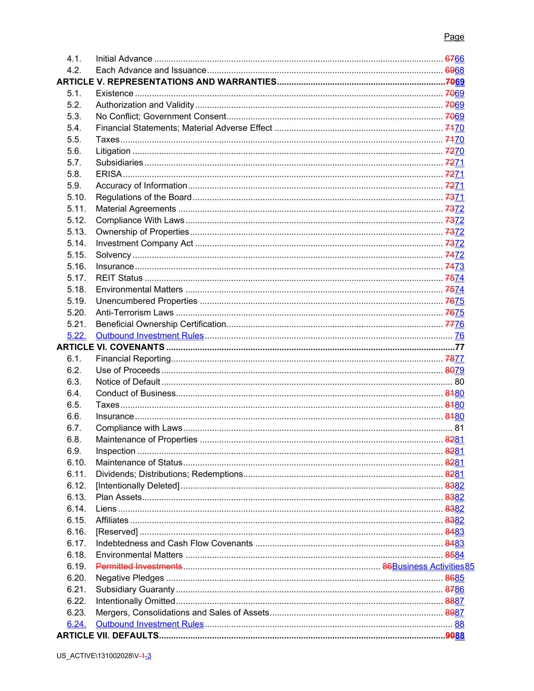 Page US_ACTIVE\131002028\V-1-3 4.1. Initial Advance ........................................................................................................................ 6766 4.2. Each Advance and Issuance .................................................................................................. 6968 ARTICLE V. REPRESENTATIONS AND WARRANTIES ......................................................................7069 5.1. Existence ................................................................................................................................ 7069 5.2. Authorization and Validity ....................................................................................................... 7069 5.3. No Conflict; Government Consent .......................................................................................... 7069 5.4. Financial Statements; Material Adverse Effect ...................................................................... 7170 5.5. Taxes ...................................................................................................................................... 7170 5.6. Litigation ................................................................................................................................. 7270 5.7. Subsidiaries ............................................................................................................................ 7271 5.8. ERISA ..................................................................................................................................... 7271 5.9. Accuracy of Information .......................................................................................................... 7271 5.10. Regulations of the Board ........................................................................................................ 7371 5.11. Material Agreements .............................................................................................................. 7372 5.12. Compliance With Laws ........................................................................................................... 7372 5.13. Ownership of Properties ......................................................................................................... 7372 5.14. Investment Company Act ....................................................................................................... 7372 5.15. Solvency ................................................................................................................................. 7472 5.16. Insurance ................................................................................................................................ 7473 5.17. REIT Status ............................................................................................................................ 7574 5.18. Environmental Matters ........................................................................................................... 7574 5.19. Unencumbered Properties ..................................................................................................... 7675 5.20. Anti-Terrorism Laws ............................................................................................................... 7675 5.21. Beneficial Ownership Certification .......................................................................................... 7776 5.22. Outbound Investment Rules ....................................................................................................... 76 ARTICLE VI. COVENANTS ........................................................................................................................77 6.1. Financial Reporting................................................................................................................. 7877 6.2. Use of Proceeds ..................................................................................................................... 8079 6.3. Notice of Default ......................................................................................................................... 80 6.4. Conduct of Business............................................................................................................... 8180 6.5. Taxes ...................................................................................................................................... 8180 6.6. Insurance ................................................................................................................................ 8180 6.7. Compliance with Laws ................................................................................................................ 81 6.8. Maintenance of Properties ..................................................................................................... 8281 6.9. Inspection ............................................................................................................................... 8281 6.10. Maintenance of Status ............................................................................................................ 8281 6.11. Dividends; Distributions; Redemptions................................................................................... 8281 6.12. [Intentionally Deleted] ............................................................................................................. 8382 6.13. Plan Assets ............................................................................................................................. 8382 6.14. Liens ....................................................................................................................................... 8382 6.15. Affiliates .................................................................................................................................. 8382 6.16. [Reserved] ...........................................................................................