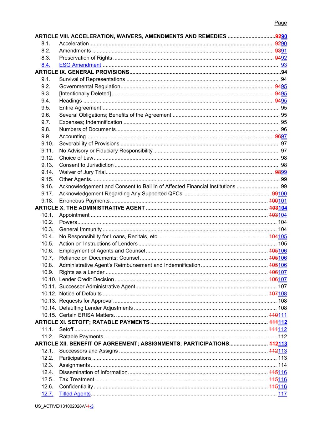 Page US_ACTIVE\131002028\V-1-3 ARTICLE VIII. ACCELERATION, WAIVERS, AMENDMENTS AND REMEDIES ................................9290 8.1. Acceleration ............................................................................................................................ 9290 8.2. Amendments .......................................................................................................................... 9391 8.3. Preservation of Rights ............................................................................................................ 9492 8.4. ESG Amendment ........................................................................................................................ 93 ARTICLE IX. GENERAL PROVISIONS ......................................................................................................94 9.1. Survival of Representations ....................................................................................................... 94 9.2. Governmental Regulation ....................................................................................................... 9495 9.3. [Intentionally Deleted] ............................................................................................................. 9495 9.4. Headings ................................................................................................................................ 9495 9.5. Entire Agreement........................................................................................................................ 95 9.6. Several Obligations; Benefits of the Agreement ........................................................................ 95 9.7. Expenses; Indemnification ......................................................................................................... 95 9.8. Numbers of Documents .............................................................................................................. 96 9.9. Accounting .............................................................................................................................. 9697 9.10. Severability of Provisions ........................................................................................................... 97 9.11. No Advisory or Fiduciary Responsibility ..................................................................................... 97 9.12. Choice of Law ............................................................................................................................. 98 9.13. Consent to Jurisdiction ............................................................................................................... 98 9.14. Waiver of Jury Trial................................................................................................................. 9899 9.15. Other Agents. ............................................................................................................................. 99 9.16. Acknowledgement and Consent to Bail In of Affected Financial Institutions ............................. 99 9.17. Acknowledgement Regarding Any Supported QFCs. .......................................................... 99100 9.18. Erroneous Payments. ......................................................................................................... 100101 ARTICLE X. THE ADMINISTRATIVE AGENT .................................................................................. 103104 10.1. Appointment ....................................................................................................................... 103104 10.2. Powers ...................................................................................................................................... 104 10.3. General Immunity ..................................................................................................................... 104 10.4. No Responsibility for Loans, Recitals, etc .......................................................................... 104105 10.5. Action on Instructions of Lenders ............................................................................................. 105 10.6. Employment of Agents and Counsel .................................................................................. 105106 10.7. Reliance on Documents; Counsel ...................................................................................... 105106 10.8. Administrative Agent’s Reimbursement and Indemnification ............................................. 105106 10.9. Rights as a Lender ............................................................................................................. 106107 10.10. Lender Credit Decision ....................................................................................................... 106107 10.11. Successor Administrative Agent ............................................................................................... 107 10.12. Notice of Defaults ............................................................................................................... 107108 10.13. Requests for Approval .............................................................................................................. 108 10.14. Defaulting Lender Adjustments ................................................................................................ 108 10.15. Certain ERISA Matters. ...................................................................................................... 110111 ARTICLE XI. SETOFF; RATABLE PAYMENTS ............................................................................... 111112 11.1. Setoff .................................................................................................................................. 111112 11.2. Ratable Payments .................................................................................................................... 112 ARTICLE XII. BENEFIT OF AGREE