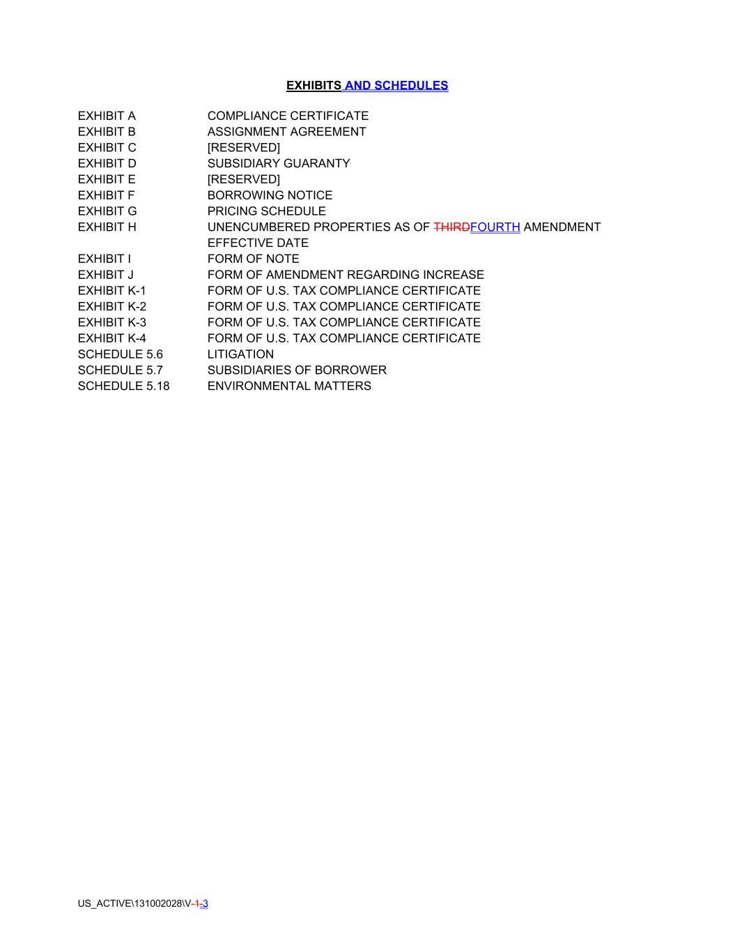 US_ACTIVE\131002028\V-1-3 EXHIBITS AND SCHEDULES EXHIBIT A COMPLIANCE CERTIFICATE EXHIBIT B ASSIGNMENT AGREEMENT EXHIBIT C [RESERVED] EXHIBIT D SUBSIDIARY GUARANTY EXHIBIT E [RESERVED] EXHIBIT F BORROWING NOTICE EXHIBIT G PRICING SCHEDULE EXHIBIT H UNENCUMBERED PROPERTIES AS OF THIRDFOURTH AMENDMENT EFFECTIVE DATE EXHIBIT I FORM OF NOTE EXHIBIT J FORM OF AMENDMENT REGARDING INCREASE EXHIBIT K-1 FORM OF U.S. TAX COMPLIANCE CERTIFICATE EXHIBIT K-2 FORM OF U.S. TAX COMPLIANCE CERTIFICATE EXHIBIT K-3 FORM OF U.S. TAX COMPLIANCE CERTIFICATE EXHIBIT K-4 FORM OF U.S. TAX COMPLIANCE CERTIFICATE SCHEDULE 5.6 LITIGATION SCHEDULE 5.7 SUBSIDIARIES OF BORROWER SCHEDULE 5.18 ENVIRONMENTAL MATTERS