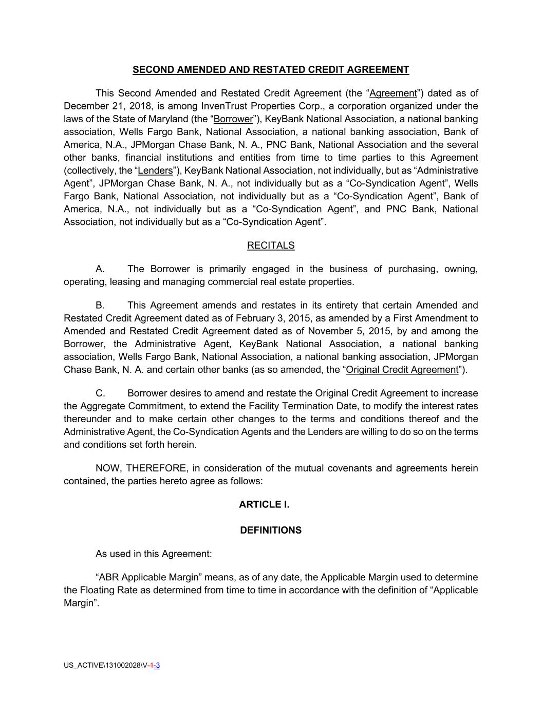 US_ACTIVE\131002028\V-1-3 SECOND AMENDED AND RESTATED CREDIT AGREEMENT This Second Amended and Restated Credit Agreement (the “Agreement”) dated as of December 21, 2018, is among InvenTrust Properties Corp., a corporation organized under the laws of the State of Maryland (the “Borrower”), KeyBank National Association, a national banking association, Wells Fargo Bank, National Association, a national banking association, Bank of America, N.A., JPMorgan Chase Bank, N. A., PNC Bank, National Association and the several other banks, financial institutions and entities from time to time parties to this Agreement (collectively, the “Lenders”), KeyBank National Association, not individually, but as “Administrative Agent”, JPMorgan Chase Bank, N. A., not individually but as a “Co-Syndication Agent”, Wells Fargo Bank, National Association, not individually but as a “Co-Syndication Agent”, Bank of America, N.A., not individually but as a “Co-Syndication Agent”, and PNC Bank, National Association, not individually but as a “Co-Syndication Agent”. RECITALS A. The Borrower is primarily engaged in the business of purchasing, owning, operating, leasing and managing commercial real estate properties. B. This Agreement amends and restates in its entirety that certain Amended and Restated Credit Agreement dated as of February 3, 2015, as amended by a First Amendment to Amended and Restated Credit Agreement dated as of November 5, 2015, by and among the Borrower, the Administrative Agent, KeyBank National Association, a national banking association, Wells Fargo Bank, National Association, a national banking association, JPMorgan Chase Bank, N. A. and certain other banks (as so amended, the “Original Credit Agreement”). C. Borrower desires to amend and restate the Original Credit Agreement to increase the Aggregate Commitment, to extend the Facility Termination Date, to modify the interest rates thereunder and to make certain other changes to the terms and conditions thereof and the Administrative Agent, the Co-Syndication Agents and the Lenders are willing to do so on the terms and conditions set forth herein. NOW, THEREFORE, in consideration of the mutual covenants and agreements herein contained, the parties hereto agree as follows: ARTICLE I. DEFINITIONS As used in this Agreement: “ABR Applicable Margin” means, as of any date, the Applicable Margin used to determine the Floating Rate as determined from time to time in accordance with the definition of “Applicable Margin”.