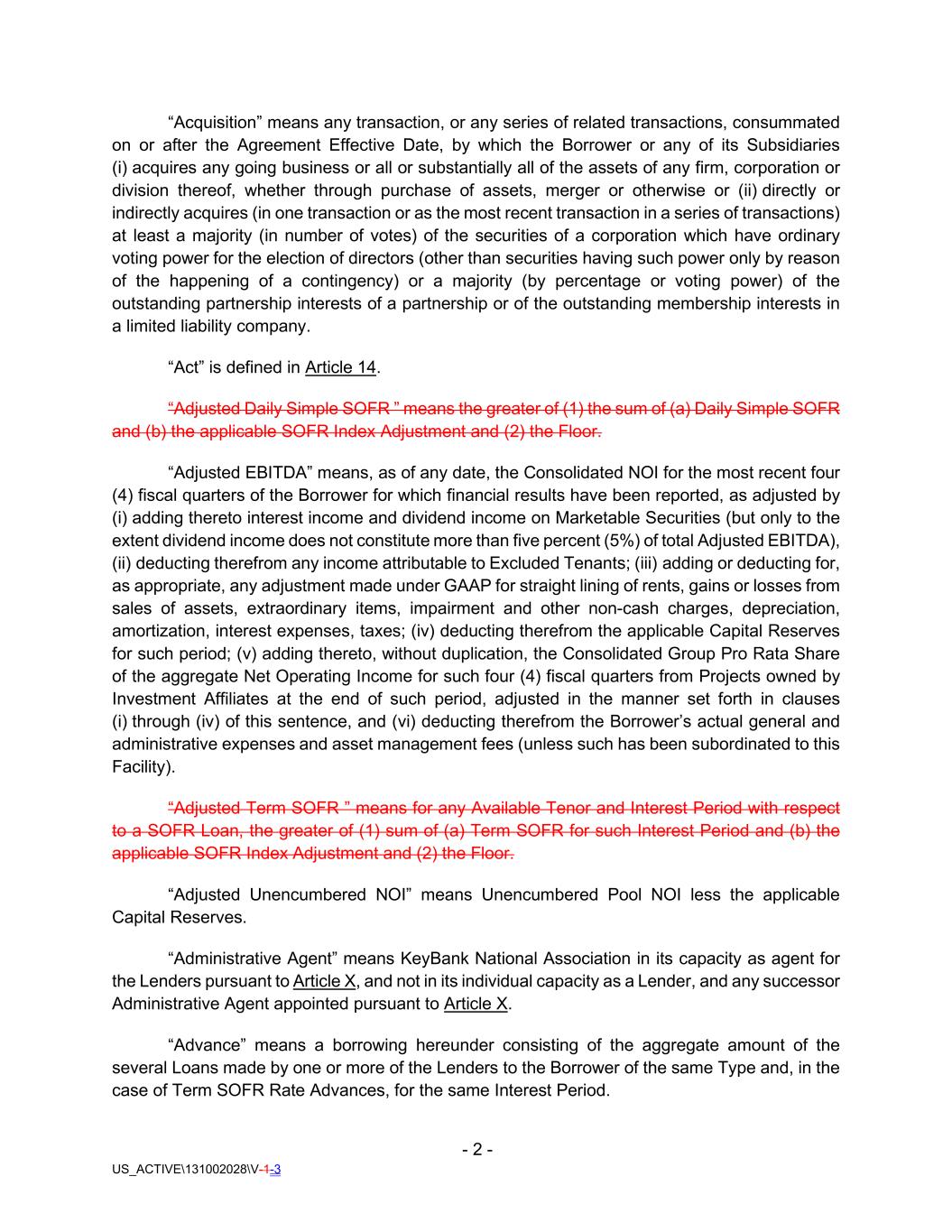 - 2 - US_ACTIVE\131002028\V-1-3 “Acquisition” means any transaction, or any series of related transactions, consummated on or after the Agreement Effective Date, by which the Borrower or any of its Subsidiaries (i) acquires any going business or all or substantially all of the assets of any firm, corporation or division thereof, whether through purchase of assets, merger or otherwise or (ii) directly or indirectly acquires (in one transaction or as the most recent transaction in a series of transactions) at least a majority (in number of votes) of the securities of a corporation which have ordinary voting power for the election of directors (other than securities having such power only by reason of the happening of a contingency) or a majority (by percentage or voting power) of the outstanding partnership interests of a partnership or of the outstanding membership interests in a limited liability company. “Act” is defined in Article 14. “Adjusted Daily Simple SOFR ” means the greater of (1) the sum of (a) Daily Simple SOFR and (b) the applicable SOFR Index Adjustment and (2) the Floor. “Adjusted EBITDA” means, as of any date, the Consolidated NOI for the most recent four (4) fiscal quarters of the Borrower for which financial results have been reported, as adjusted by (i) adding thereto interest income and dividend income on Marketable Securities (but only to the extent dividend income does not constitute more than five percent (5%) of total Adjusted EBITDA), (ii) deducting therefrom any income attributable to Excluded Tenants; (iii) adding or deducting for, as appropriate, any adjustment made under GAAP for straight lining of rents, gains or losses from sales of assets, extraordinary items, impairment and other non-cash charges, depreciation, amortization, interest expenses, taxes; (iv) deducting therefrom the applicable Capital Reserves for such period; (v) adding thereto, without duplication, the Consolidated Group Pro Rata Share of the aggregate Net Operating Income for such four (4) fiscal quarters from Projects owned by Investment Affiliates at the end of such period, adjusted in the manner set forth in clauses (i) through (iv) of this sentence, and (vi) deducting therefrom the Borrower’s actual general and administrative expenses and asset management fees (unless such has been subordinated to this Facility). “Adjusted Term SOFR ” means for any Available Tenor and Interest Period with respect to a SOFR Loan, the greater of (1) sum of (a) Term SOFR for such Interest Period and (b) the applicable SOFR Index Adjustment and (2) the Floor. “Adjusted Unencumbered NOI” means Unencumbered Pool NOI less the applicable Capital Reserves. “Administrative Agent” means KeyBank National Association in its capacity as agent for the Lenders pursuant to Article X, and not in its individual capacity as a Lender, and any successor Administrative Agent appointed pursuant to Article X. “Advance” means a borrowing hereunder consisting of the aggregate amount of the several Loans made by one or more of the Lenders to the Borrower of the same Type and, in the case of Term SOFR Rate Advances, for the same Interest Period.