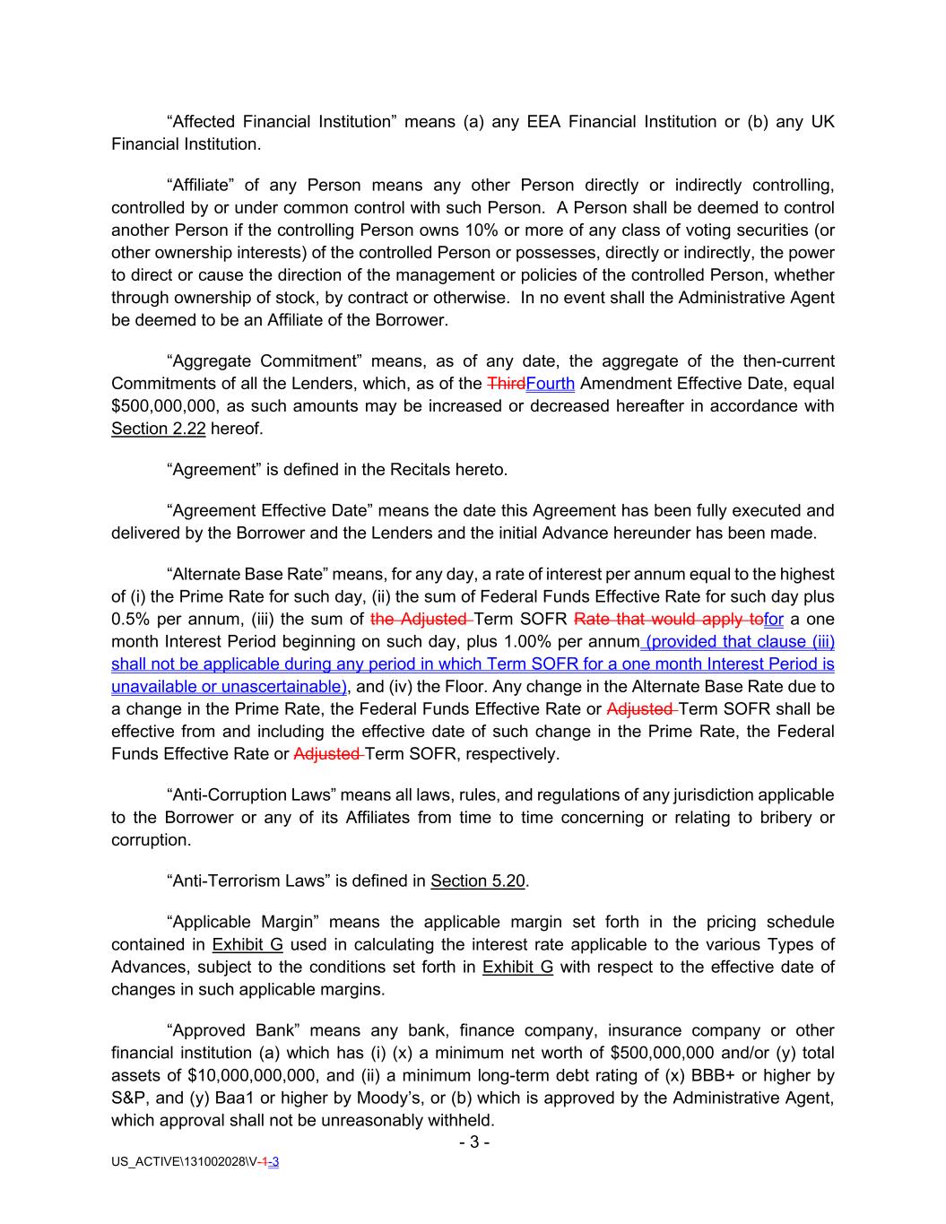 - 3 - US_ACTIVE\131002028\V-1-3 “Affected Financial Institution” means (a) any EEA Financial Institution or (b) any UK Financial Institution. “Affiliate” of any Person means any other Person directly or indirectly controlling, controlled by or under common control with such Person. A Person shall be deemed to control another Person if the controlling Person owns 10% or more of any class of voting securities (or other ownership interests) of the controlled Person or possesses, directly or indirectly, the power to direct or cause the direction of the management or policies of the controlled Person, whether through ownership of stock, by contract or otherwise. In no event shall the Administrative Agent be deemed to be an Affiliate of the Borrower. “Aggregate Commitment” means, as of any date, the aggregate of the then-current Commitments of all the Lenders, which, as of the ThirdFourth Amendment Effective Date, equal $500,000,000, as such amounts may be increased or decreased hereafter in accordance with Section 2.22 hereof. “Agreement” is defined in the Recitals hereto. “Agreement Effective Date” means the date this Agreement has been fully executed and delivered by the Borrower and the Lenders and the initial Advance hereunder has been made. “Alternate Base Rate” means, for any day, a rate of interest per annum equal to the highest of (i) the Prime Rate for such day, (ii) the sum of Federal Funds Effective Rate for such day plus 0.5% per annum, (iii) the sum of the Adjusted Term SOFR Rate that would apply tofor a one month Interest Period beginning on such day, plus 1.00% per annum (provided that clause (iii) shall not be applicable during any period in which Term SOFR for a one month Interest Period is unavailable or unascertainable), and (iv) the Floor. Any change in the Alternate Base Rate due to a change in the Prime Rate, the Federal Funds Effective Rate or Adjusted Term SOFR shall be effective from and including the effective date of such change in the Prime Rate, the Federal Funds Effective Rate or Adjusted Term SOFR, respectively. “Anti-Corruption Laws” means all laws, rules, and regulations of any jurisdiction applicable to the Borrower or any of its Affiliates from time to time concerning or relating to bribery or corruption. “Anti-Terrorism Laws” is defined in Section 5.20. “Applicable Margin” means the applicable margin set forth in the pricing schedule contained in Exhibit G used in calculating the interest rate applicable to the various Types of Advances, subject to the conditions set forth in Exhibit G with respect to the effective date of changes in such applicable margins. “Approved Bank” means any bank, finance company, insurance company or other financial institution (a) which has (i) (x) a minimum net worth of $500,000,000 and/or (y) total assets of $10,000,000,000, and (ii) a minimum long-term debt rating of (x) BBB+ or higher by S&P, and (y) Baa1 or higher by Moody’s, or (b) which is approved by the Administrative Agent, which approval shall not be unreasonably withheld.