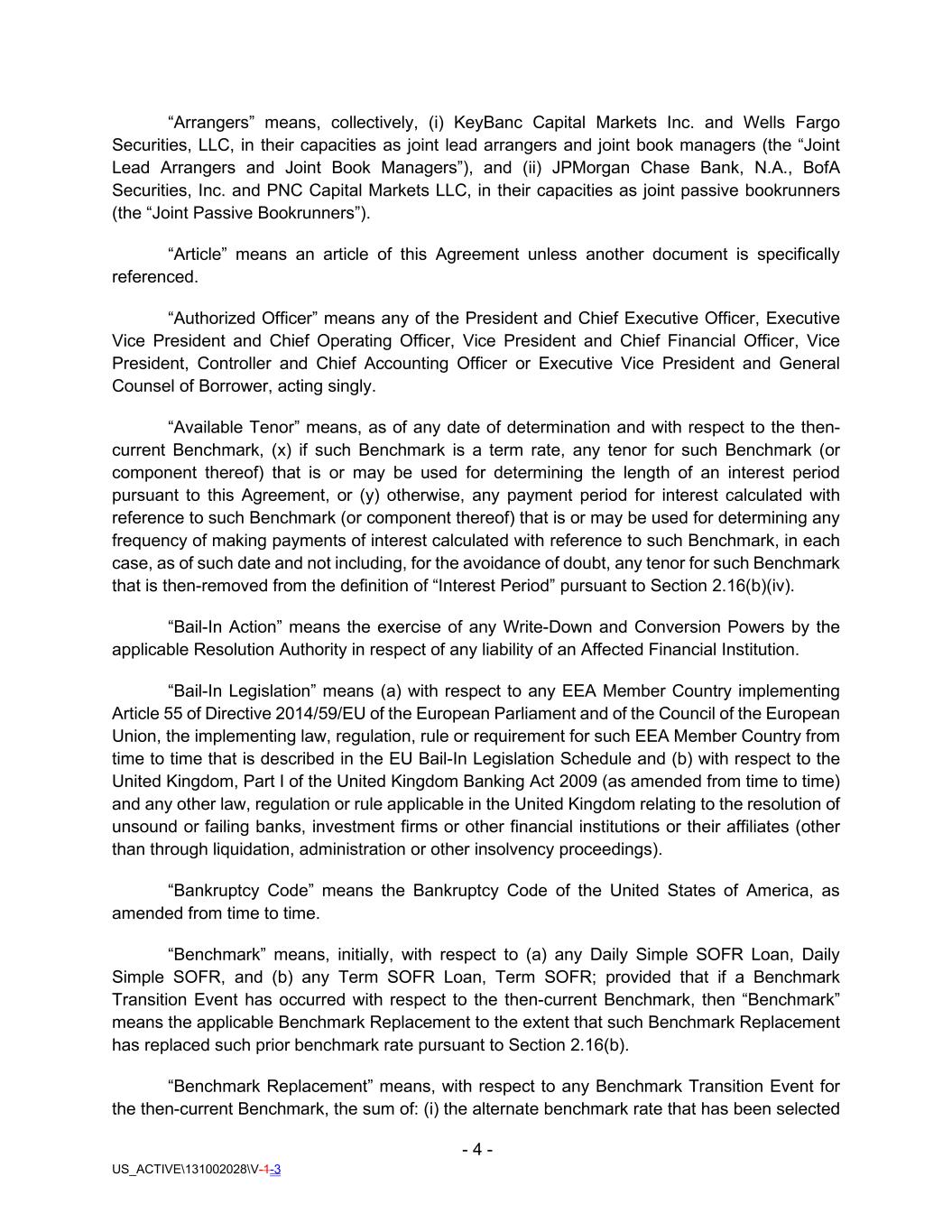 - 4 - US_ACTIVE\131002028\V-1-3 “Arrangers” means, collectively, (i) KeyBanc Capital Markets Inc. and Wells Fargo Securities, LLC, in their capacities as joint lead arrangers and joint book managers (the “Joint Lead Arrangers and Joint Book Managers”), and (ii) JPMorgan Chase Bank, N.A., BofA Securities, Inc. and PNC Capital Markets LLC, in their capacities as joint passive bookrunners (the “Joint Passive Bookrunners”). “Article” means an article of this Agreement unless another document is specifically referenced. “Authorized Officer” means any of the President and Chief Executive Officer, Executive Vice President and Chief Operating Officer, Vice President and Chief Financial Officer, Vice President, Controller and Chief Accounting Officer or Executive Vice President and General Counsel of Borrower, acting singly. “Available Tenor” means, as of any date of determination and with respect to the then- current Benchmark, (x) if such Benchmark is a term rate, any tenor for such Benchmark (or component thereof) that is or may be used for determining the length of an interest period pursuant to this Agreement, or (y) otherwise, any payment period for interest calculated with reference to such Benchmark (or component thereof) that is or may be used for determining any frequency of making payments of interest calculated with reference to such Benchmark, in each case, as of such date and not including, for the avoidance of doubt, any tenor for such Benchmark that is then-removed from the definition of “Interest Period” pursuant to Section 2.16(b)(iv). “Bail-In Action” means the exercise of any Write-Down and Conversion Powers by the applicable Resolution Authority in respect of any liability of an Affected Financial Institution. “Bail-In Legislation” means (a) with respect to any EEA Member Country implementing Article 55 of Directive 2014/59/EU of the European Parliament and of the Council of the European Union, the implementing law, regulation, rule or requirement for such EEA Member Country from time to time that is described in the EU Bail-In Legislation Schedule and (b) with respect to the United Kingdom, Part I of the United Kingdom Banking Act 2009 (as amended from time to time) and any other law, regulation or rule applicable in the United Kingdom relating to the resolution of unsound or failing banks, investment firms or other financial institutions or their affiliates (other than through liquidation, administration or other insolvency proceedings). “Bankruptcy Code” means the Bankruptcy Code of the United States of America, as amended from time to time. “Benchmark” means, initially, with respect to (a) any Daily Simple SOFR Loan, Daily Simple SOFR, and (b) any Term SOFR Loan, Term SOFR; provided that if a Benchmark Transition Event has occurred with respect to the then-current Benchmark, then “Benchmark” means the applicable Benchmark Replacement to the extent that such Benchmark Replacement has replaced such prior benchmark rate pursuant to Section 2.16(b). “Benchmark Replacement” means, with respect to any Benchmark Transition Event for the then-current Benchmark, the sum of: (i) the alternate benchmark rate that has been selected