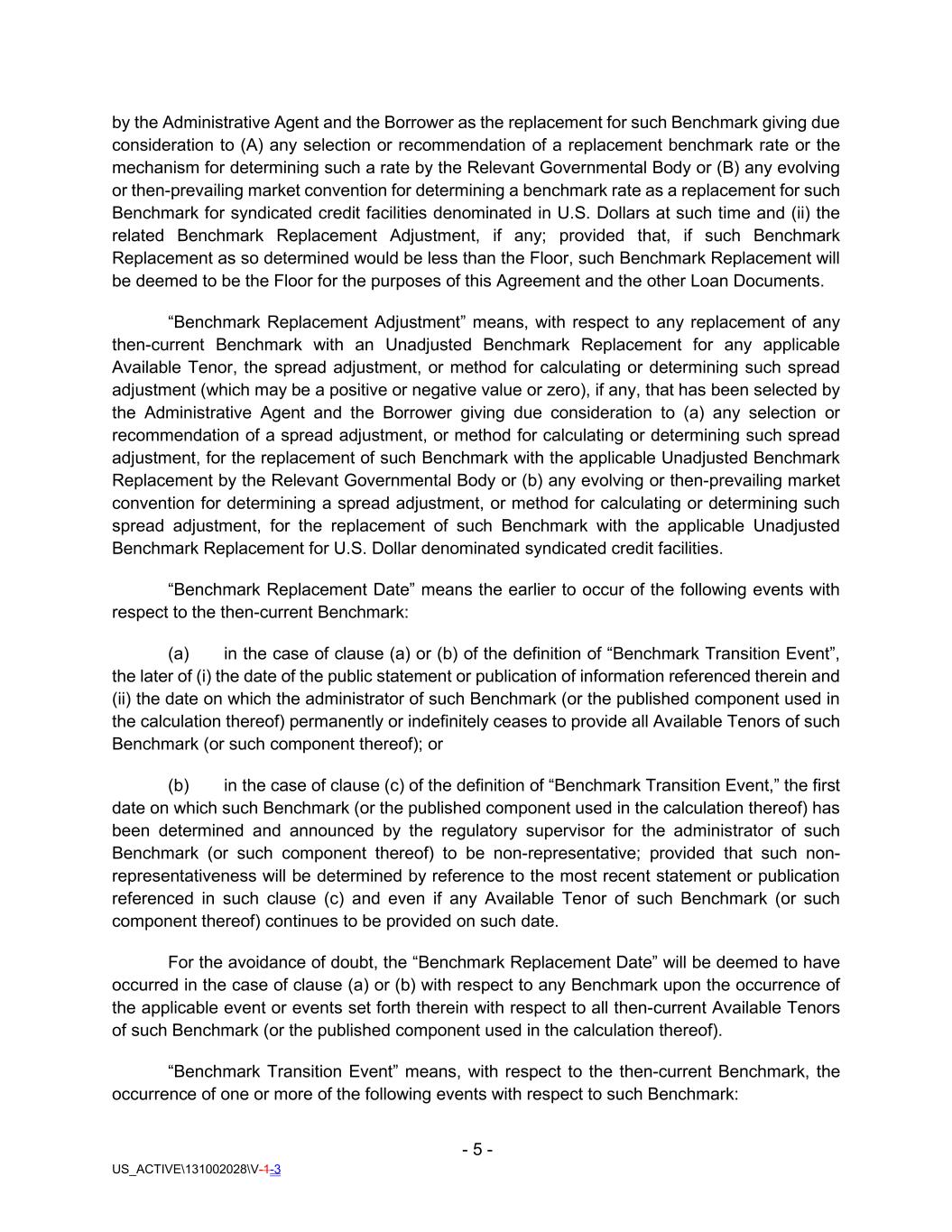 - 5 - US_ACTIVE\131002028\V-1-3 by the Administrative Agent and the Borrower as the replacement for such Benchmark giving due consideration to (A) any selection or recommendation of a replacement benchmark rate or the mechanism for determining such a rate by the Relevant Governmental Body or (B) any evolving or then-prevailing market convention for determining a benchmark rate as a replacement for such Benchmark for syndicated credit facilities denominated in U.S. Dollars at such time and (ii) the related Benchmark Replacement Adjustment, if any; provided that, if such Benchmark Replacement as so determined would be less than the Floor, such Benchmark Replacement will be deemed to be the Floor for the purposes of this Agreement and the other Loan Documents. “Benchmark Replacement Adjustment” means, with respect to any replacement of any then-current Benchmark with an Unadjusted Benchmark Replacement for any applicable Available Tenor, the spread adjustment, or method for calculating or determining such spread adjustment (which may be a positive or negative value or zero), if any, that has been selected by the Administrative Agent and the Borrower giving due consideration to (a) any selection or recommendation of a spread adjustment, or method for calculating or determining such spread adjustment, for the replacement of such Benchmark with the applicable Unadjusted Benchmark Replacement by the Relevant Governmental Body or (b) any evolving or then-prevailing market convention for determining a spread adjustment, or method for calculating or determining such spread adjustment, for the replacement of such Benchmark with the applicable Unadjusted Benchmark Replacement for U.S. Dollar denominated syndicated credit facilities. “Benchmark Replacement Date” means the earlier to occur of the following events with respect to the then-current Benchmark: (a) in the case of clause (a) or (b) of the definition of “Benchmark Transition Event”, the later of (i) the date of the public statement or publication of information referenced therein and (ii) the date on which the administrator of such Benchmark (or the published component used in the calculation thereof) permanently or indefinitely ceases to provide all Available Tenors of such Benchmark (or such component thereof); or (b) in the case of clause (c) of the definition of “Benchmark Transition Event,” the first date on which such Benchmark (or the published component used in the calculation thereof) has been determined and announced by the regulatory supervisor for the administrator of such Benchmark (or such component thereof) to be non-representative; provided that such non- representativeness will be determined by reference to the most recent statement or publication referenced in such clause (c) and even if any Available Tenor of such Benchmark (or such component thereof) continues to be provided on such date. For the avoidance of doubt, the “Benchmark Replacement Date” will be deemed to have occurred in the case of clause (a) or (b) with respect to any Benchmark upon the occurrence of the applicable event or events set forth therein with respect to all then-current Available Tenors of such Benchmark (or the published component used in the calculation thereof). “Benchmark Transition Event” means, with respect to the then-current Benchmark, the occurrence of one or more of the following events with respect to such Benchmark: