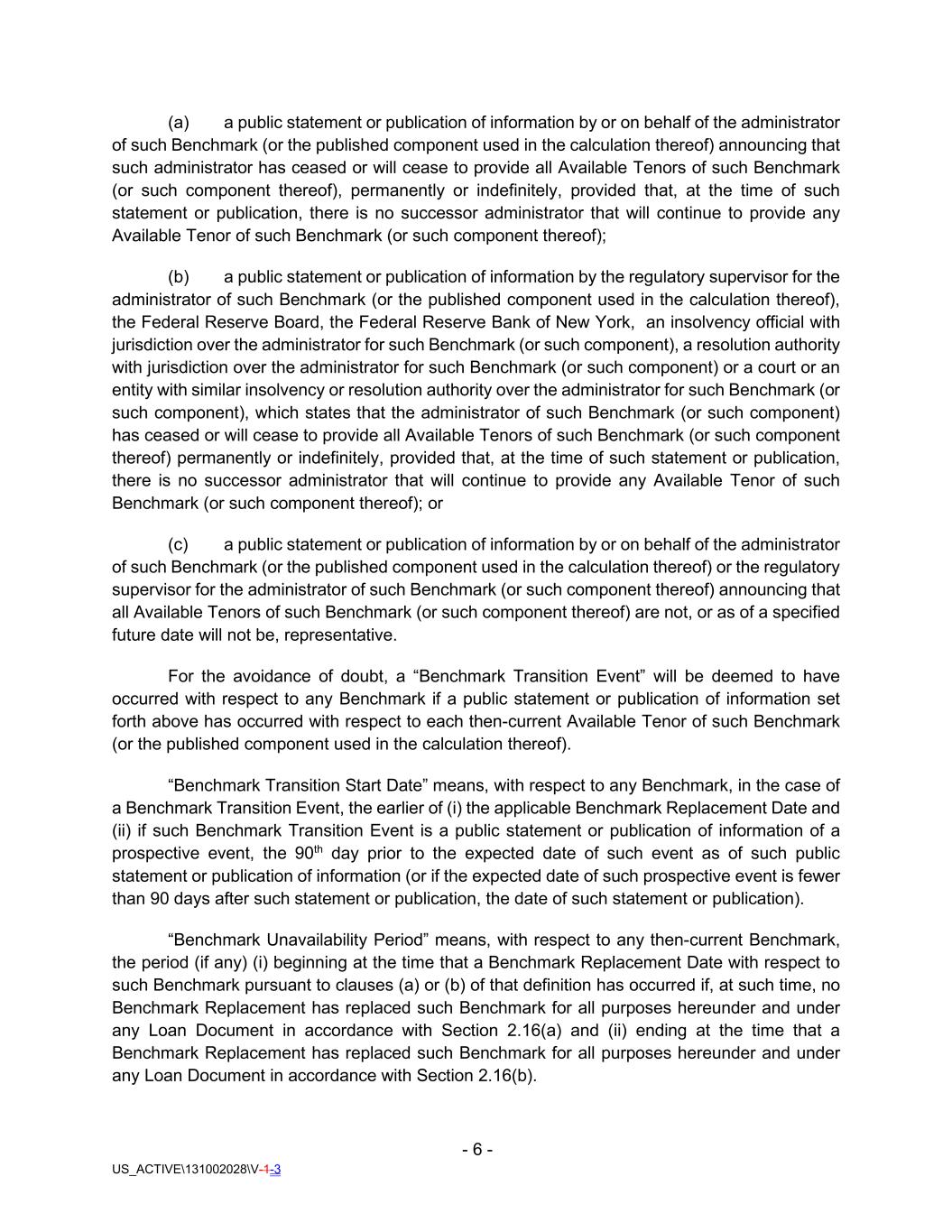- 6 - US_ACTIVE\131002028\V-1-3 (a) a public statement or publication of information by or on behalf of the administrator of such Benchmark (or the published component used in the calculation thereof) announcing that such administrator has ceased or will cease to provide all Available Tenors of such Benchmark (or such component thereof), permanently or indefinitely, provided that, at the time of such statement or publication, there is no successor administrator that will continue to provide any Available Tenor of such Benchmark (or such component thereof); (b) a public statement or publication of information by the regulatory supervisor for the administrator of such Benchmark (or the published component used in the calculation thereof), the Federal Reserve Board, the Federal Reserve Bank of New York, an insolvency official with jurisdiction over the administrator for such Benchmark (or such component), a resolution authority with jurisdiction over the administrator for such Benchmark (or such component) or a court or an entity with similar insolvency or resolution authority over the administrator for such Benchmark (or such component), which states that the administrator of such Benchmark (or such component) has ceased or will cease to provide all Available Tenors of such Benchmark (or such component thereof) permanently or indefinitely, provided that, at the time of such statement or publication, there is no successor administrator that will continue to provide any Available Tenor of such Benchmark (or such component thereof); or (c) a public statement or publication of information by or on behalf of the administrator of such Benchmark (or the published component used in the calculation thereof) or the regulatory supervisor for the administrator of such Benchmark (or such component thereof) announcing that all Available Tenors of such Benchmark (or such component thereof) are not, or as of a specified future date will not be, representative. For the avoidance of doubt, a “Benchmark Transition Event” will be deemed to have occurred with respect to any Benchmark if a public statement or publication of information set forth above has occurred with respect to each then-current Available Tenor of such Benchmark (or the published component used in the calculation thereof). “Benchmark Transition Start Date” means, with respect to any Benchmark, in the case of a Benchmark Transition Event, the earlier of (i) the applicable Benchmark Replacement Date and (ii) if such Benchmark Transition Event is a public statement or publication of information of a prospective event, the 90th day prior to the expected date of such event as of such public statement or publication of information (or if the expected date of such prospective event is fewer than 90 days after such statement or publication, the date of such statement or publication). “Benchmark Unavailability Period” means, with respect to any then-current Benchmark, the period (if any) (i) beginning at the time that a Benchmark Replacement Date with respect to such Benchmark pursuant to clauses (a) or (b) of that definition has occurred if, at such time, no Benchmark Replacement has replaced such Benchmark for all purposes hereunder and under any Loan Document in accordance with Section 2.16(a) and (ii) ending at the time that a Benchmark Replacement has replaced such Benchmark for all purposes hereunder and under any Loan Document in accordance with Section 2.16(b).